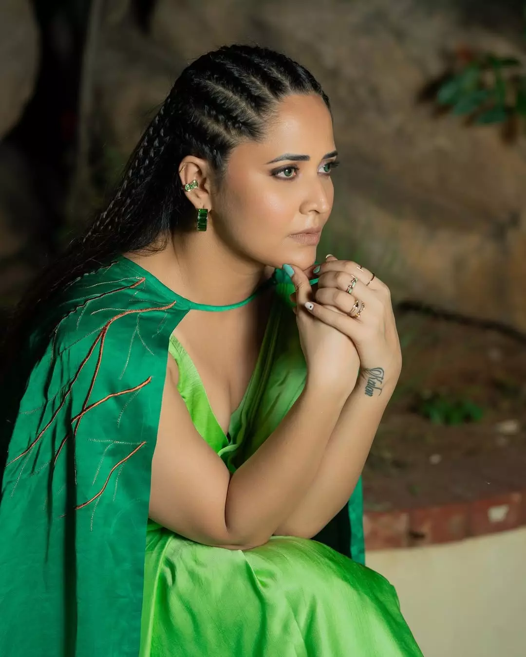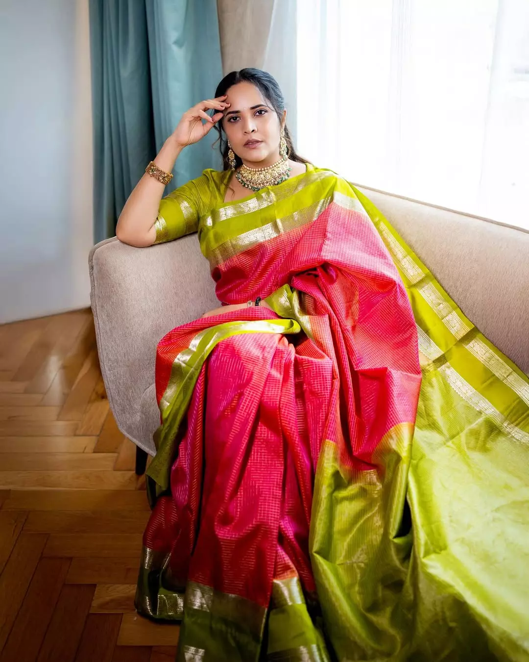 Actress Anasuya Bharadwaj shared a new picture on Instagram. She wore a bright green and pink silk saree. She paired it with a designer blouse.
