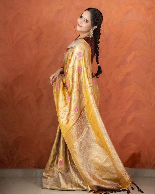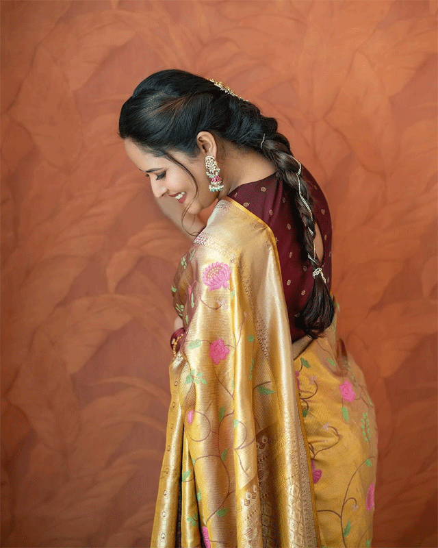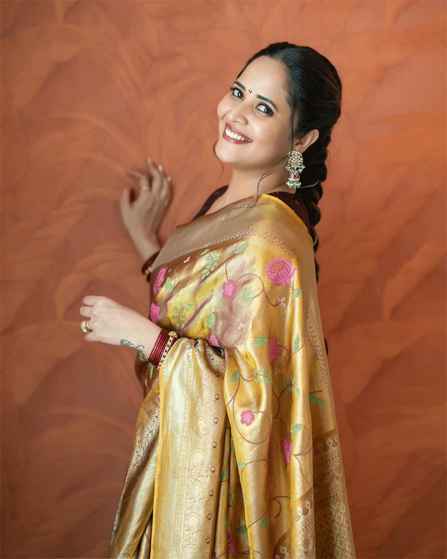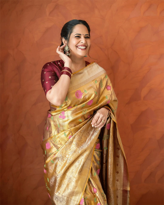 In a recent Instagram post, actress and television personality Anasuya Bharadwaj portrayed an elegant traditional look. She is seen donning a rich gold Kanjeevaram saree paired with a maroon blouse featuring gold polka embroidery.