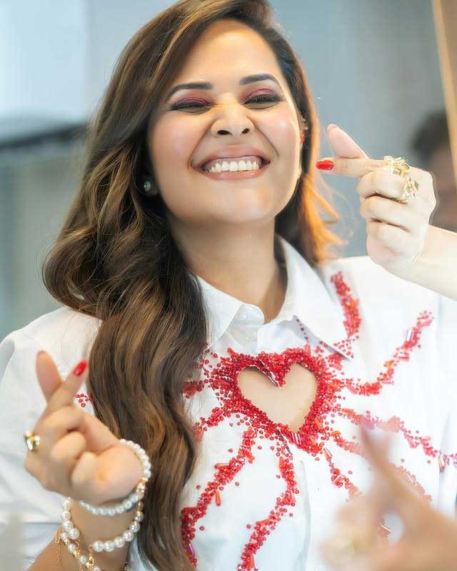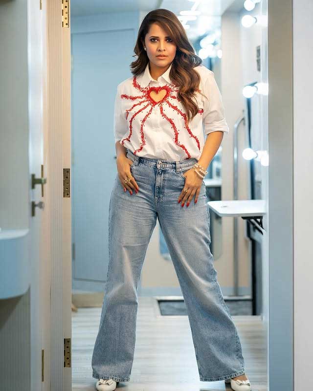 By: Tupaki Desk | 17 May 2025 3:06 PM ISTPopular Telugu anchor and actress Anasuya Bharadwaj shared a lovely new photo on her Instagram. In the picture, she is seen wearing a white shirt decorated with red beadwork in the shape of a heart and rays paired with light blue denim jeans. Her hair is styled in soft waves, and she looks confident and elegant. Anasuya captioned the post with heart and fire emojis and the phrase “#LoveAll 🔍😉”.