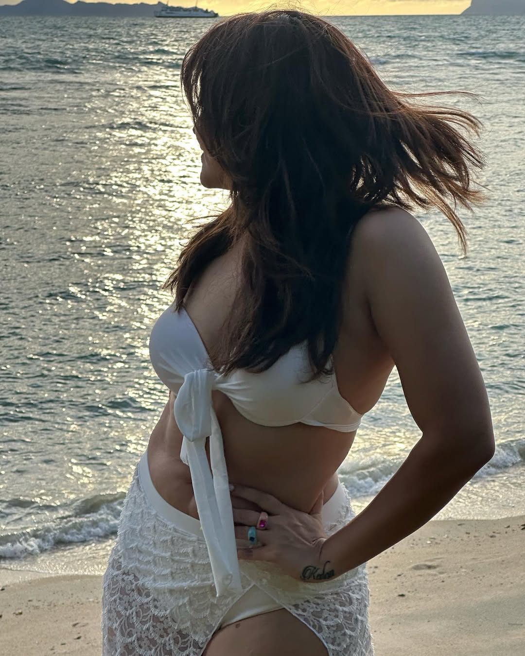 Anasuya Bharadwaj shared a new picture from the beach. She wore a white two-piece with a sheer wrap skirt. She smiled at the camera while walking near the waves. The background had a calm sea and a peaceful sunset.