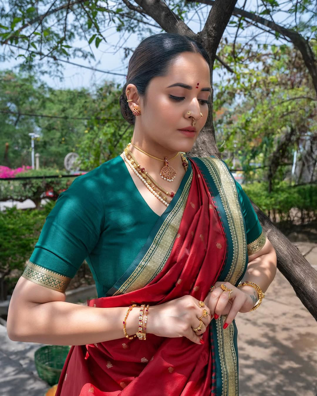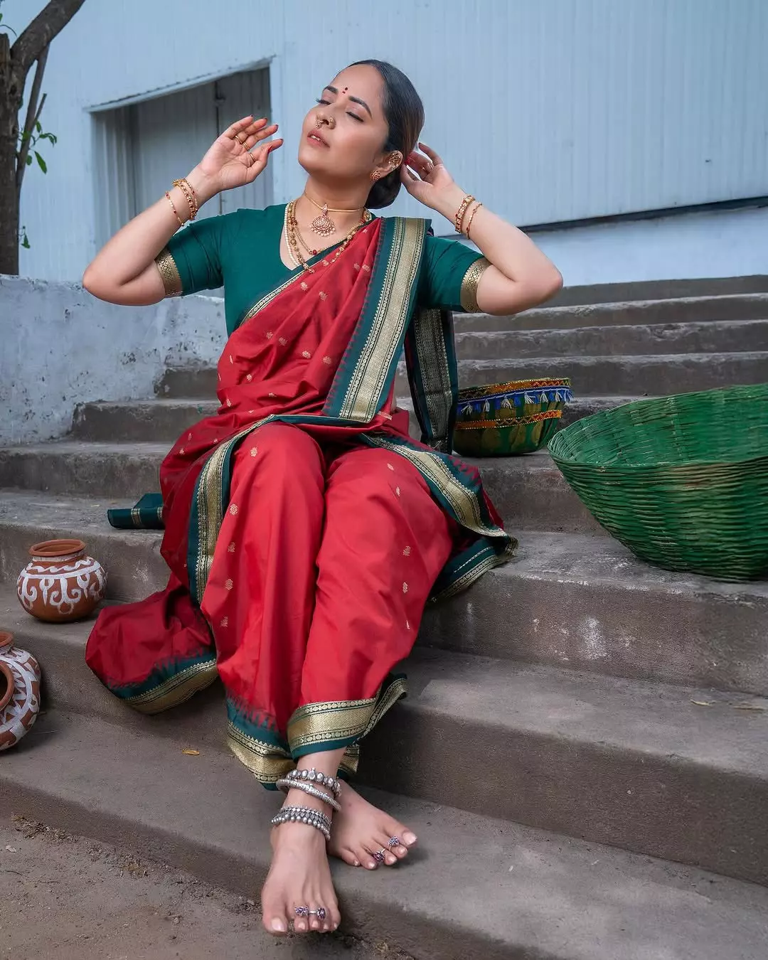 Popular anchor and actress Anasuya Bharadwaj shared a beautiful picture on Instagram wearing a traditional 9-yard saree. She is styled in a complete village theme. She looked absolutely adorable with traditional jewellery and makeup. Anasuya said in her caption that though wearing a 9-yard saree comes with challenges like long shooting hours (about 16 hours) and not being able to take proper breaks as she loved every bit of the look.