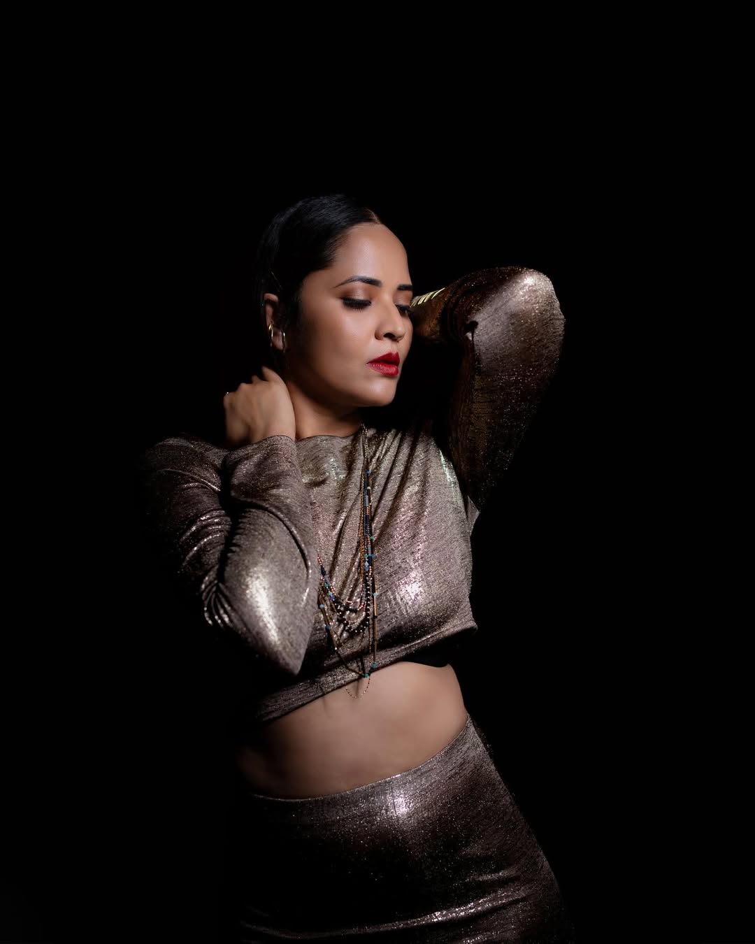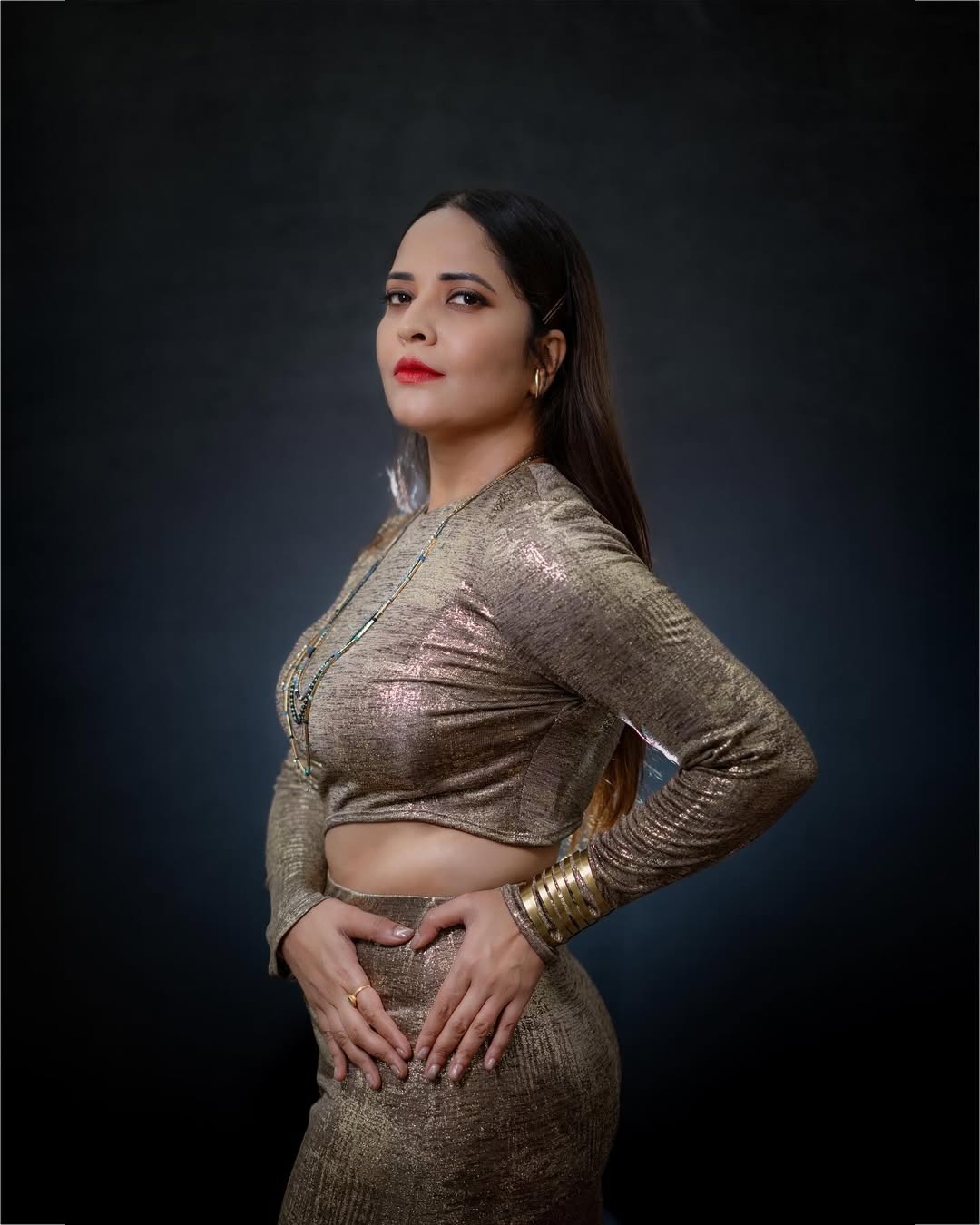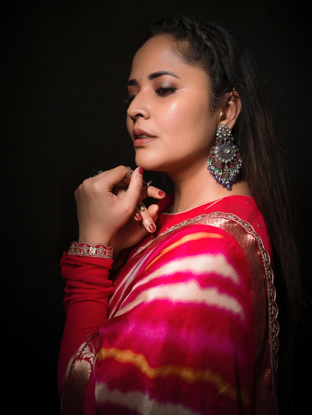 In the caption, Anasuya gave credit to her entire team: "Blouse & Styling @sreemukhi.mekala, MUA @makeupbysiva, HSA @rajesh_chinchili, Jewellery @bcos_its_silver, Lensman @verendar_photography, Celeb Mgmt @umediaentertainments_, @kalyansunkara, Asst by @kondeti_karthik."