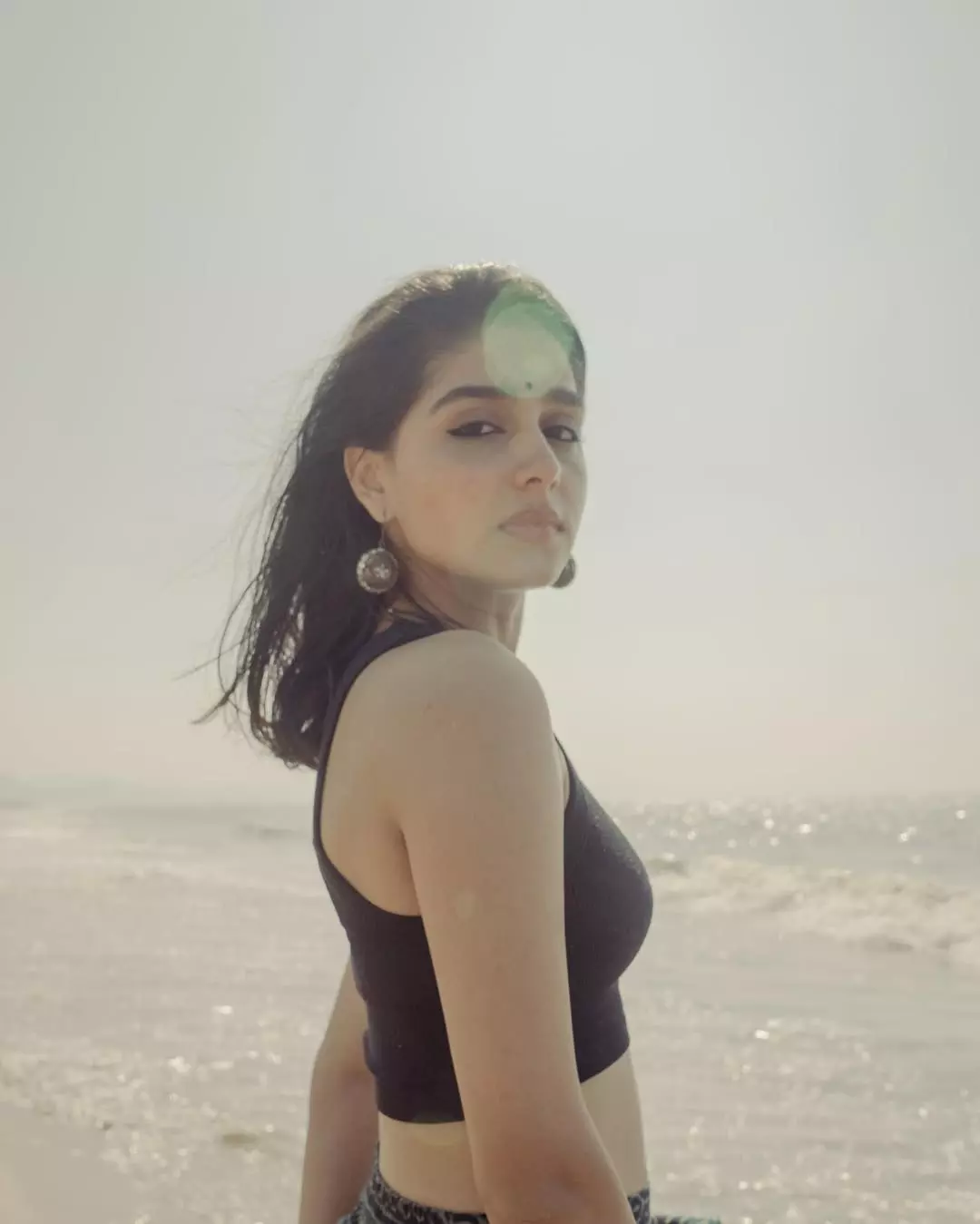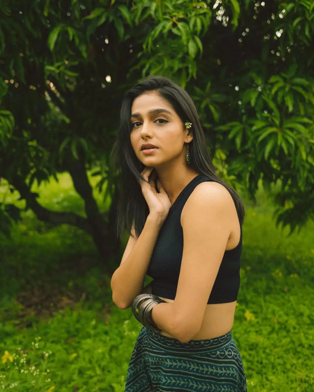 The soft greenery and muted tones of the setting complement her understated outfit, creating a frame that feels both grounded and refreshing. Anaswara’s poised stance and thoughtful gaze add depth to the photograph, making it more than just a fashion moment — it’s a reflection of her evolving artistic persona.