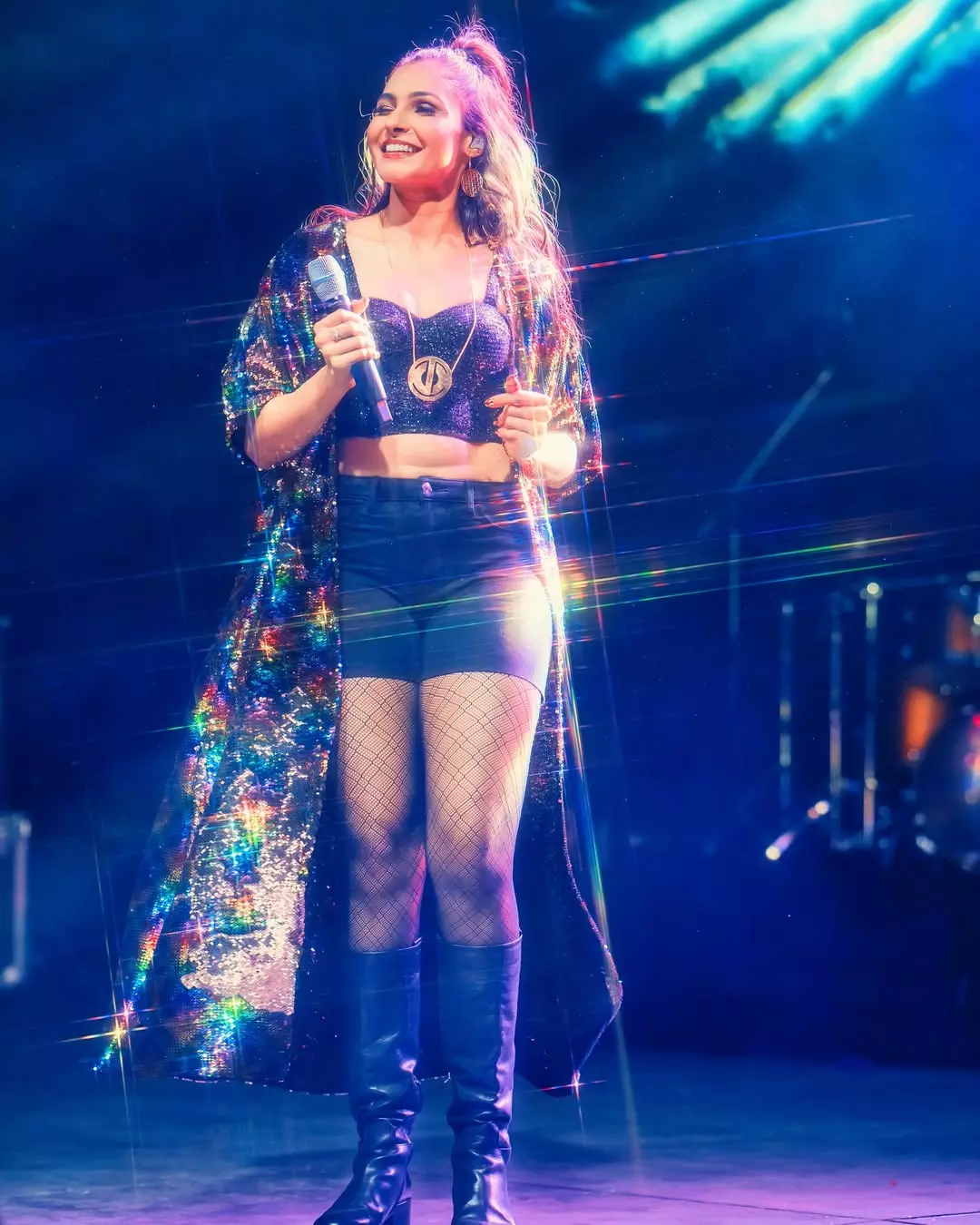 Andrea Jeremiah recently took to Instagram sharing a radiant photo from her latest performance with the caption: "Dreaming in technicolor 🌈." She is seen dressed in a glittery jacket, black crop top, shorts, fishnet stockings and high boots.