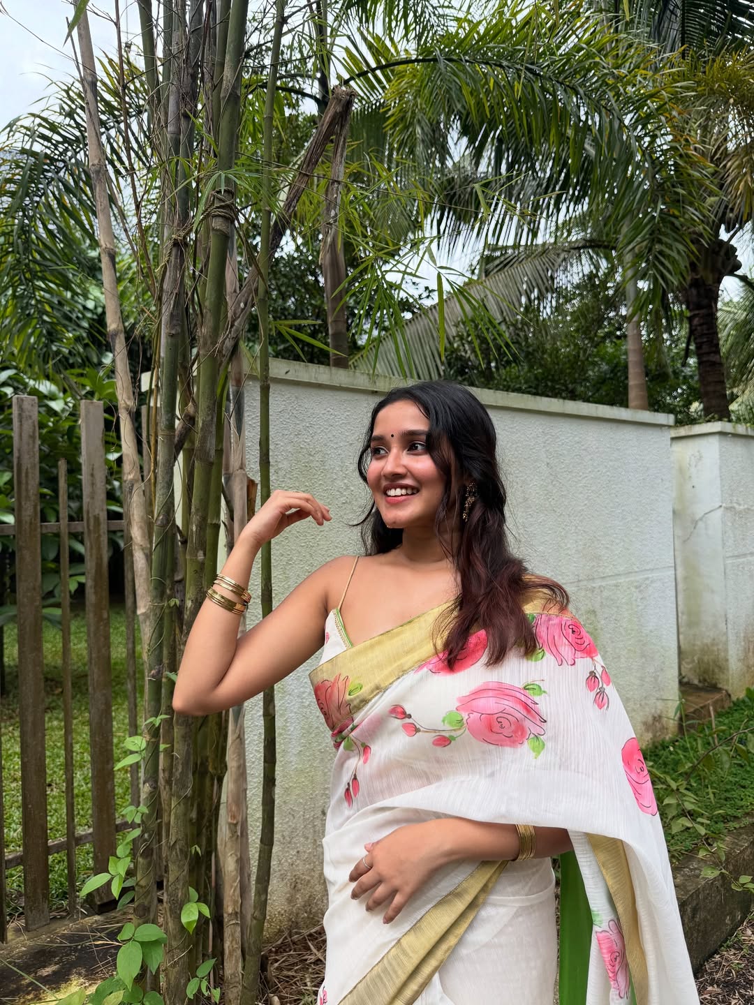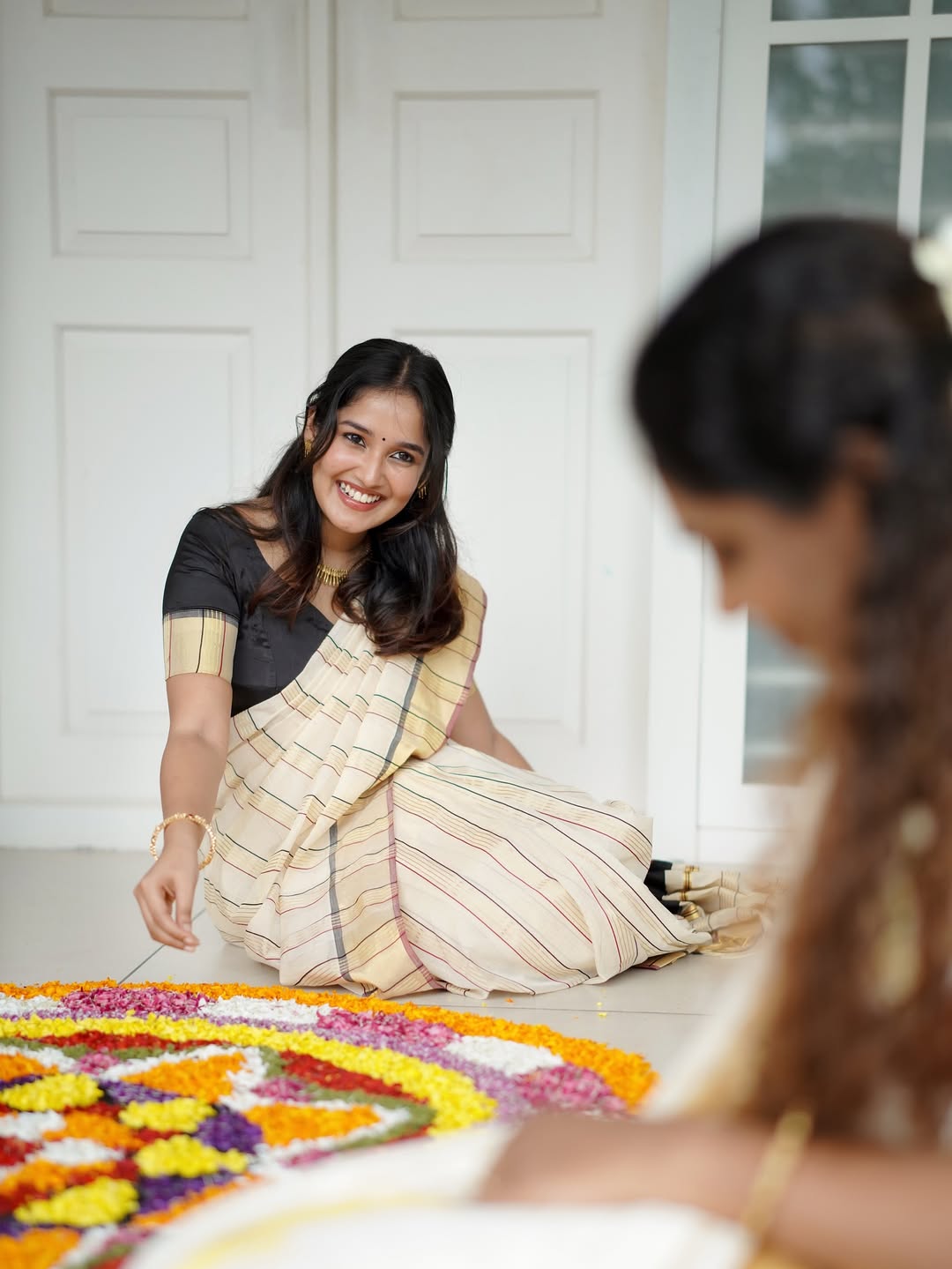 Anikha Surendran shared a new post on Instagram. She wore a traditional saree and sat near a pookalam. Her smile in the picture is bright. The moment shows joy and celebration. The post is part of the Onam festival spirit.