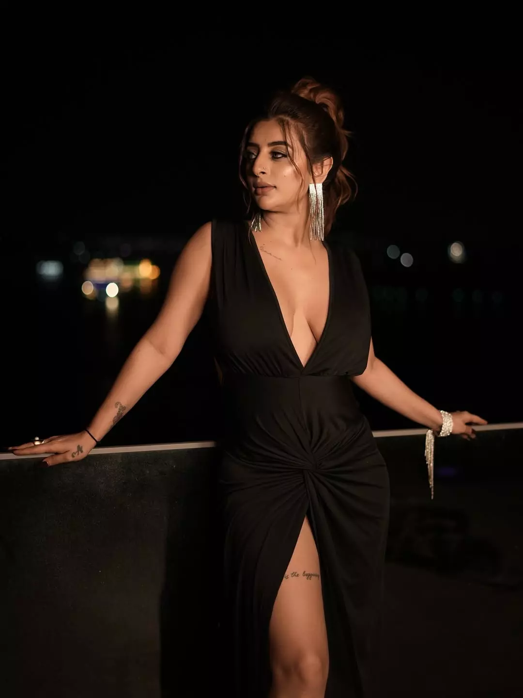 In the picture, Ankita is seen standing by the railing with the lights of Goa shining in the background. She wore a long black gown with a slit, accessorized with silver earrings and a bracelet.