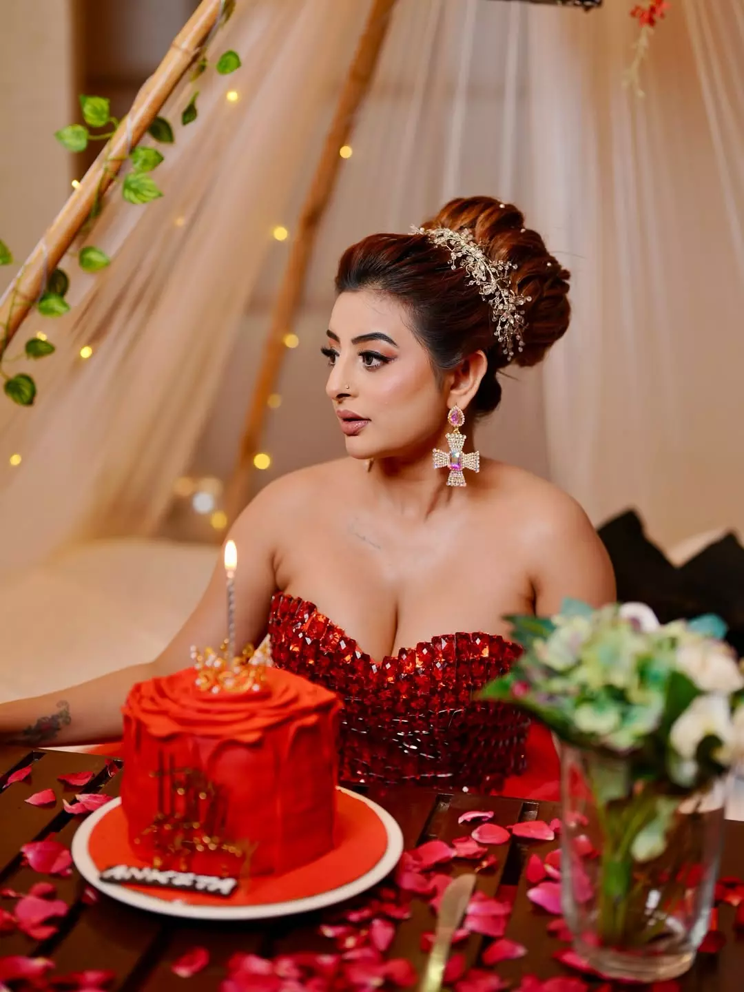 In this stunning capture, Ankita Dave embodies effortless elegance in a shimmering white gown that drapes beautifully over her silhouette, adorned with intricate lace details and sparkling crystal straps that catch the light just so.