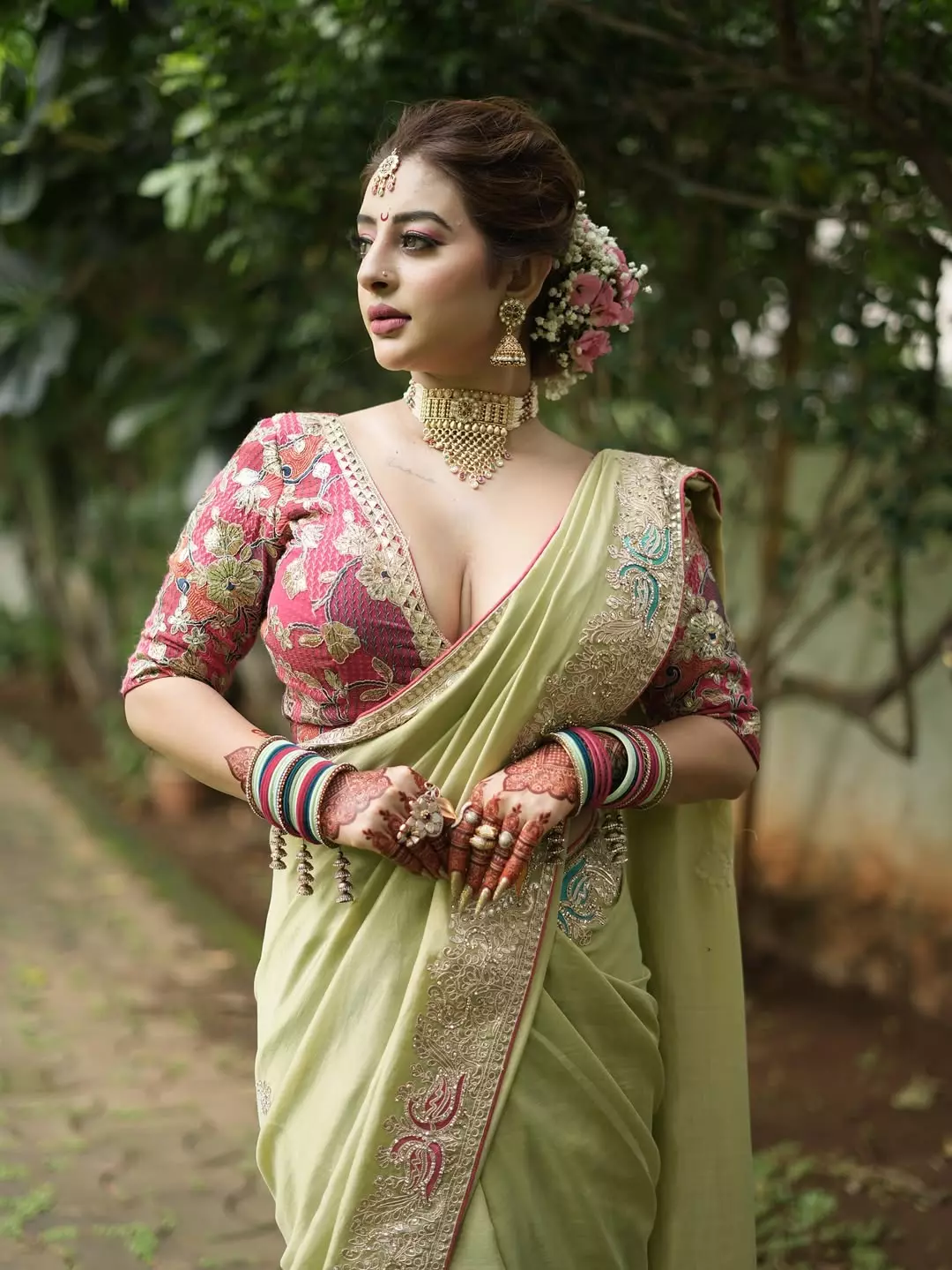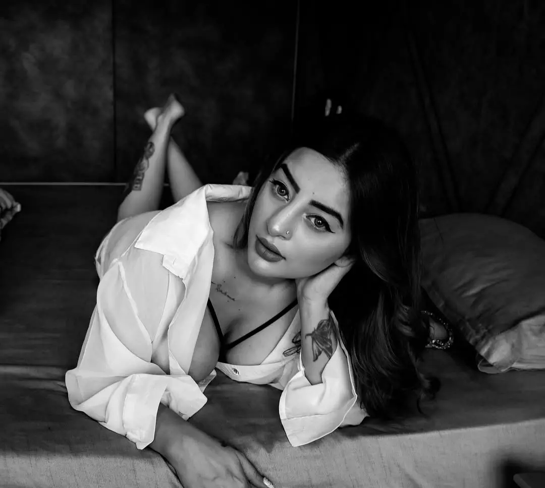 In this stunning capture, Ankita Dave embodies effortless elegance in a shimmering white gown that drapes beautifully over her silhouette, adorned with intricate lace details and sparkling crystal straps that catch the light just so. Perched gracefully on a rustic table amidst lush greenery and ornate chairs, she exudes a sultry confidence with her signature ponytail, dangling silver earrings, and subtle tattoo peeking from her arm—her kohl-lined eyes gazing thoughtfully into the distance. The Goa breeze, golden hour, and me — that’s the vibe , as the soft evening light bathes the scene in a warm, ethereal glow, with potted plants and open glass doors framing the tropical serenity. Location courtesy: @rajankhanna1