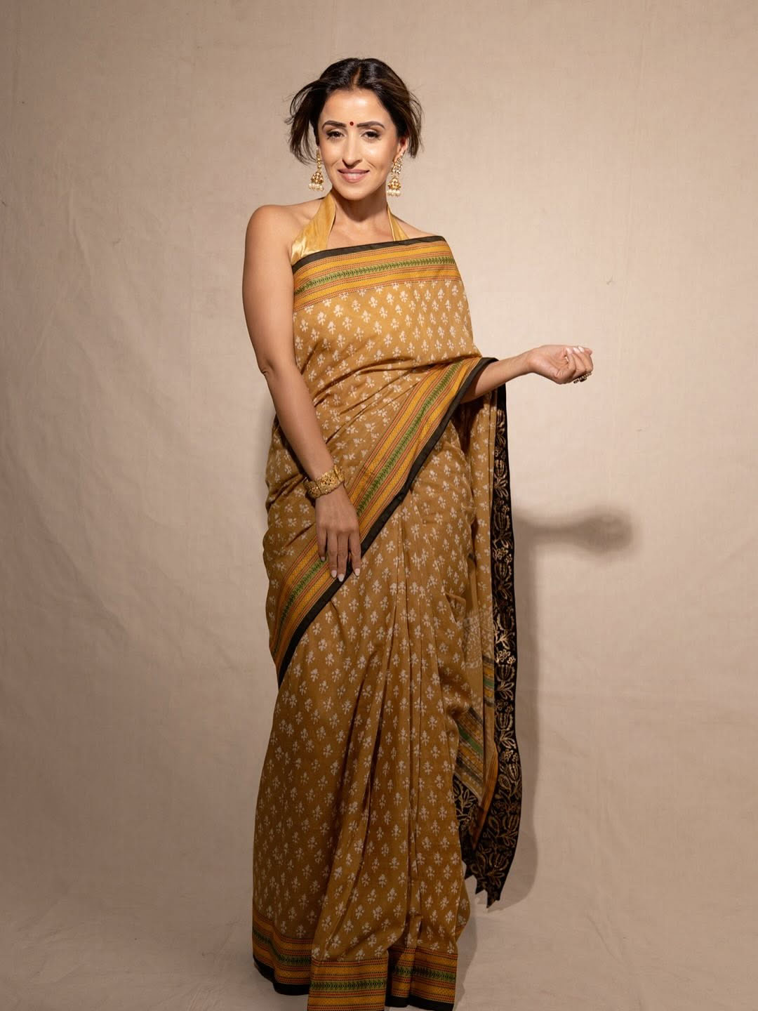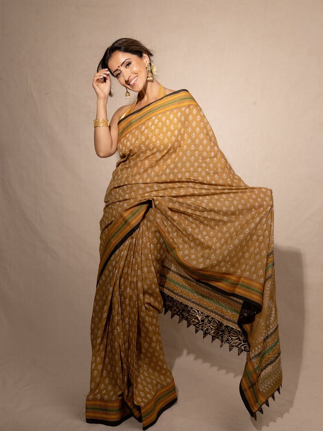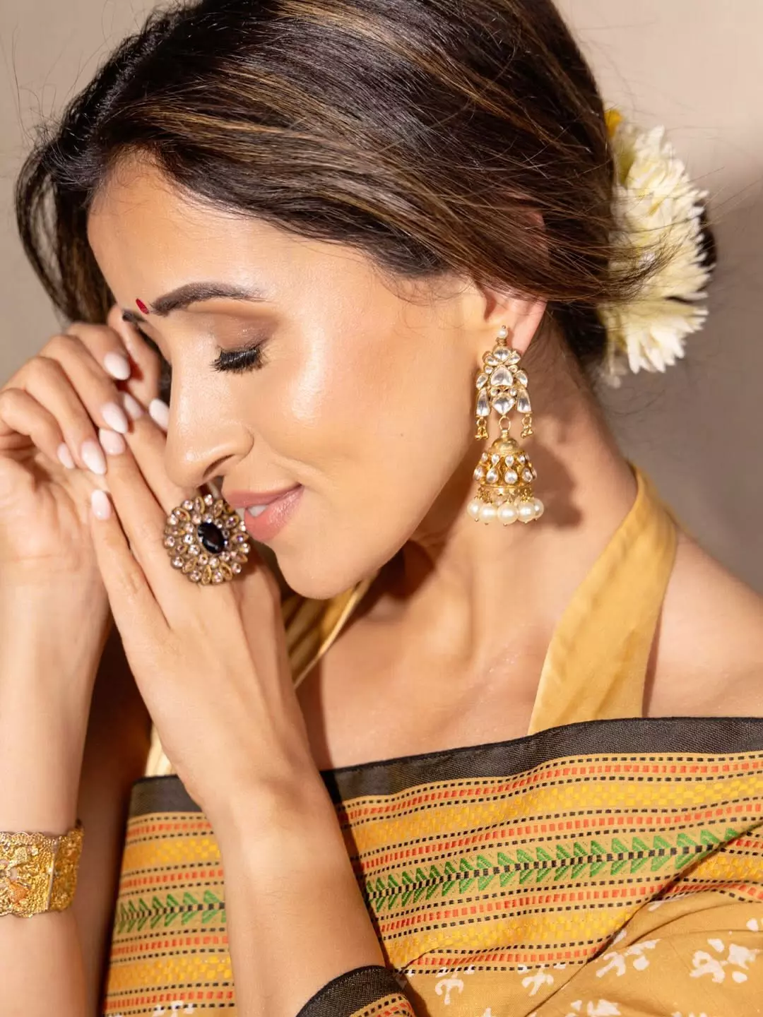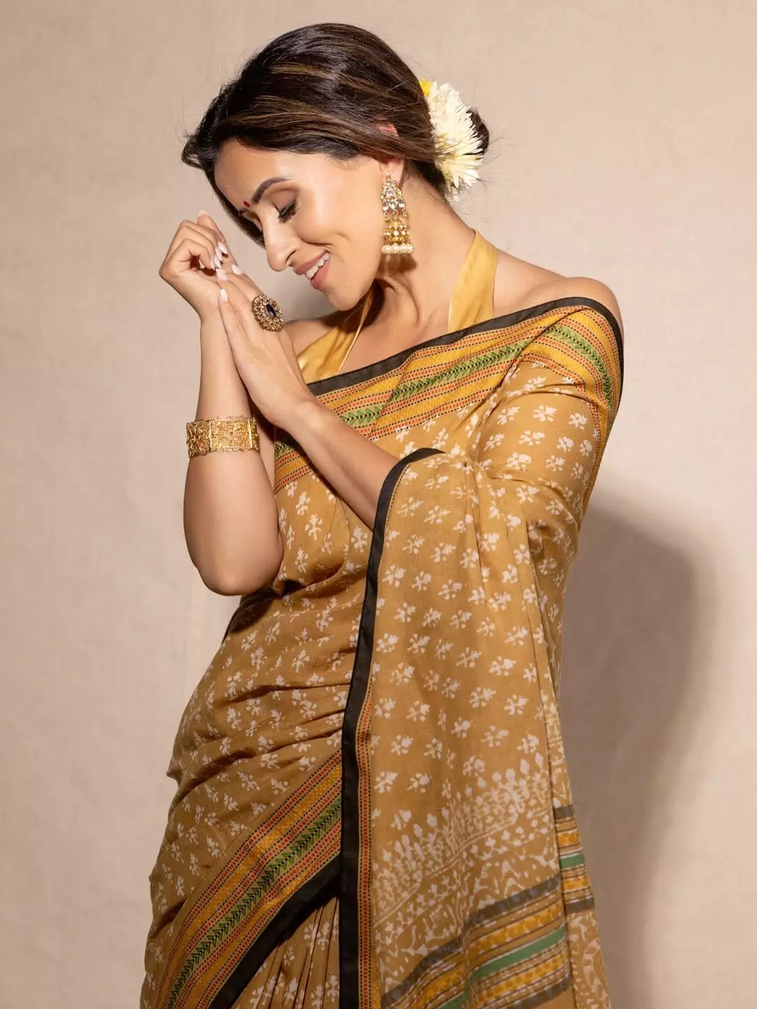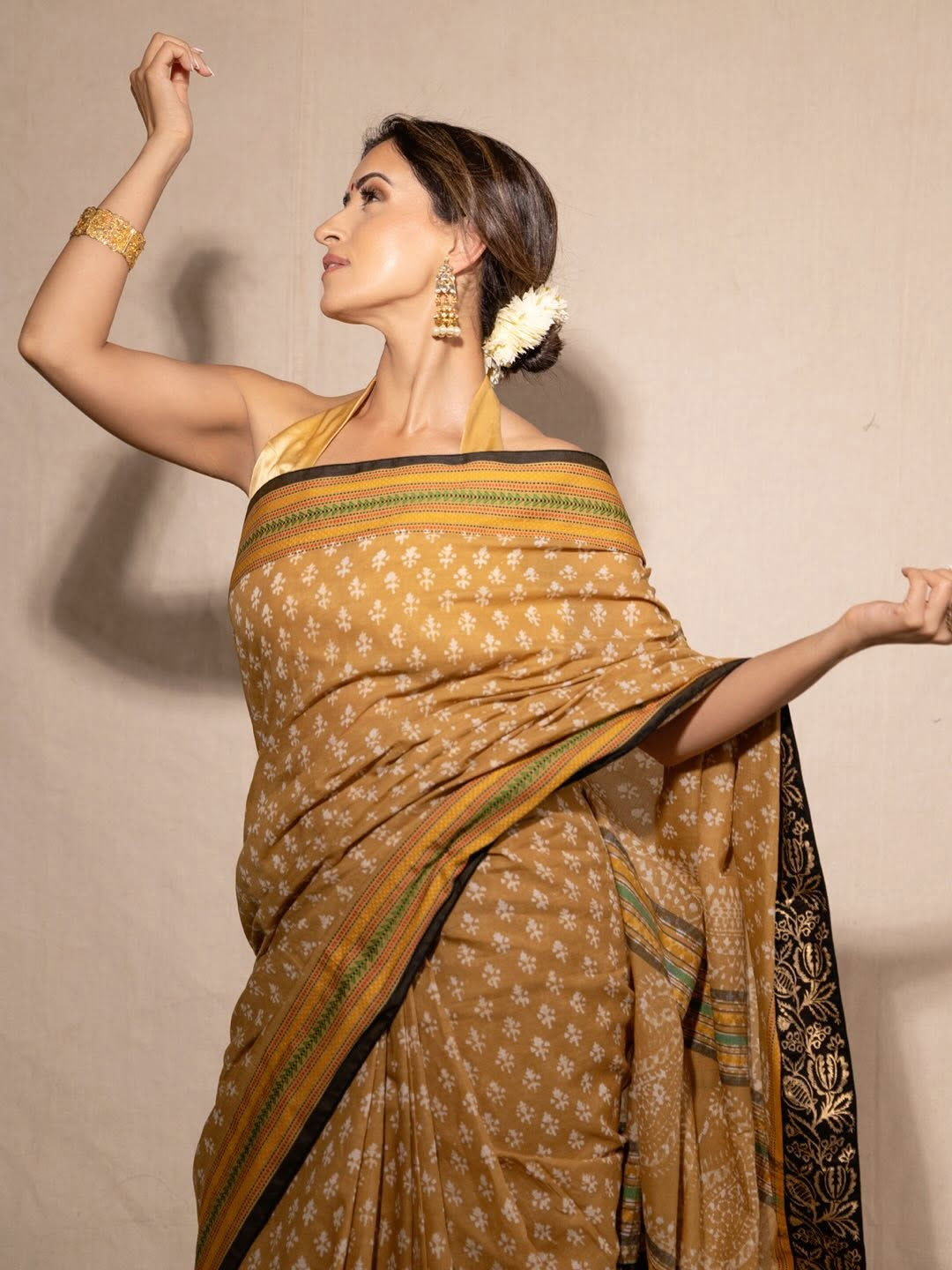 By: Tupaki Desk | 23 July 2025 10:06 PM ISTActor Anshu Ambani shared a graceful picture on Instagram. She wore a mustard yellow saree that had soft white prints and a detailed border. Anshu posed mid-dance, showing classic elegance. She had jasmine flowers neatly tucked in her bun and wore traditional gold jewelry.