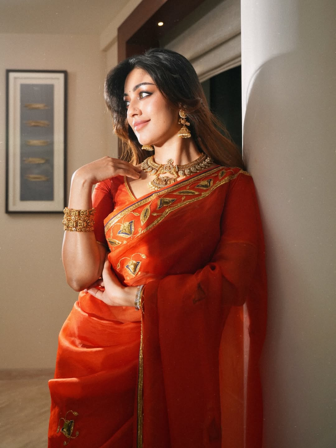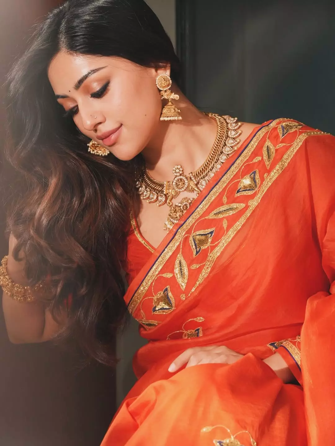 Anu Emmanuel dazzles in a vibrant orange Raw Mango saree with intricate gold embroidery, exuding timeless elegance and modern charm. Adorned with exquisite gold jewellery from Manjula Jewellers, her look is perfectly styled by Manogna Gollapudi, with flawless makeup and hair by Avni Rambhia and elegant saree draping by Janz Makeup Artist. Captured beautifully by photographer Prachu Prashanth.