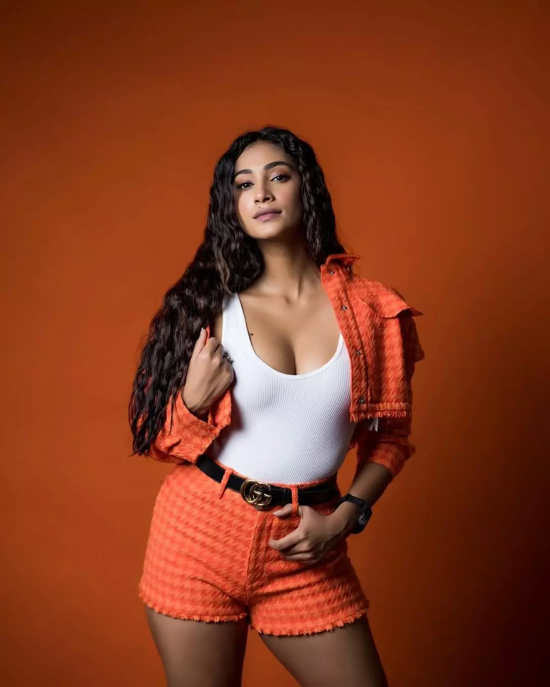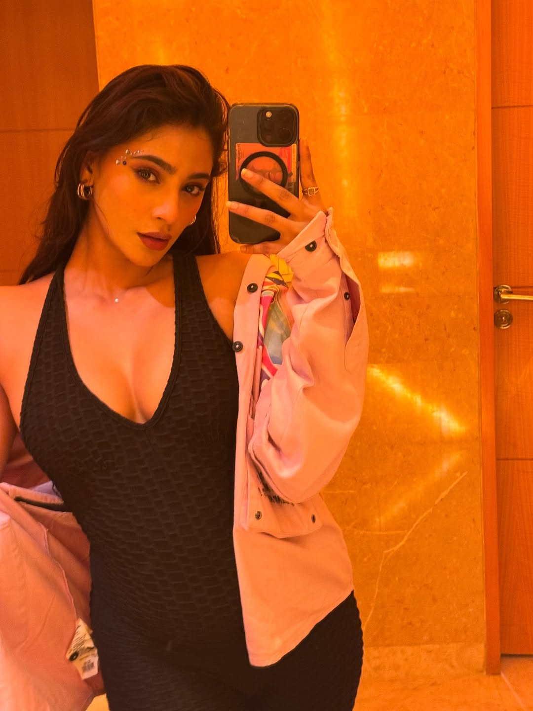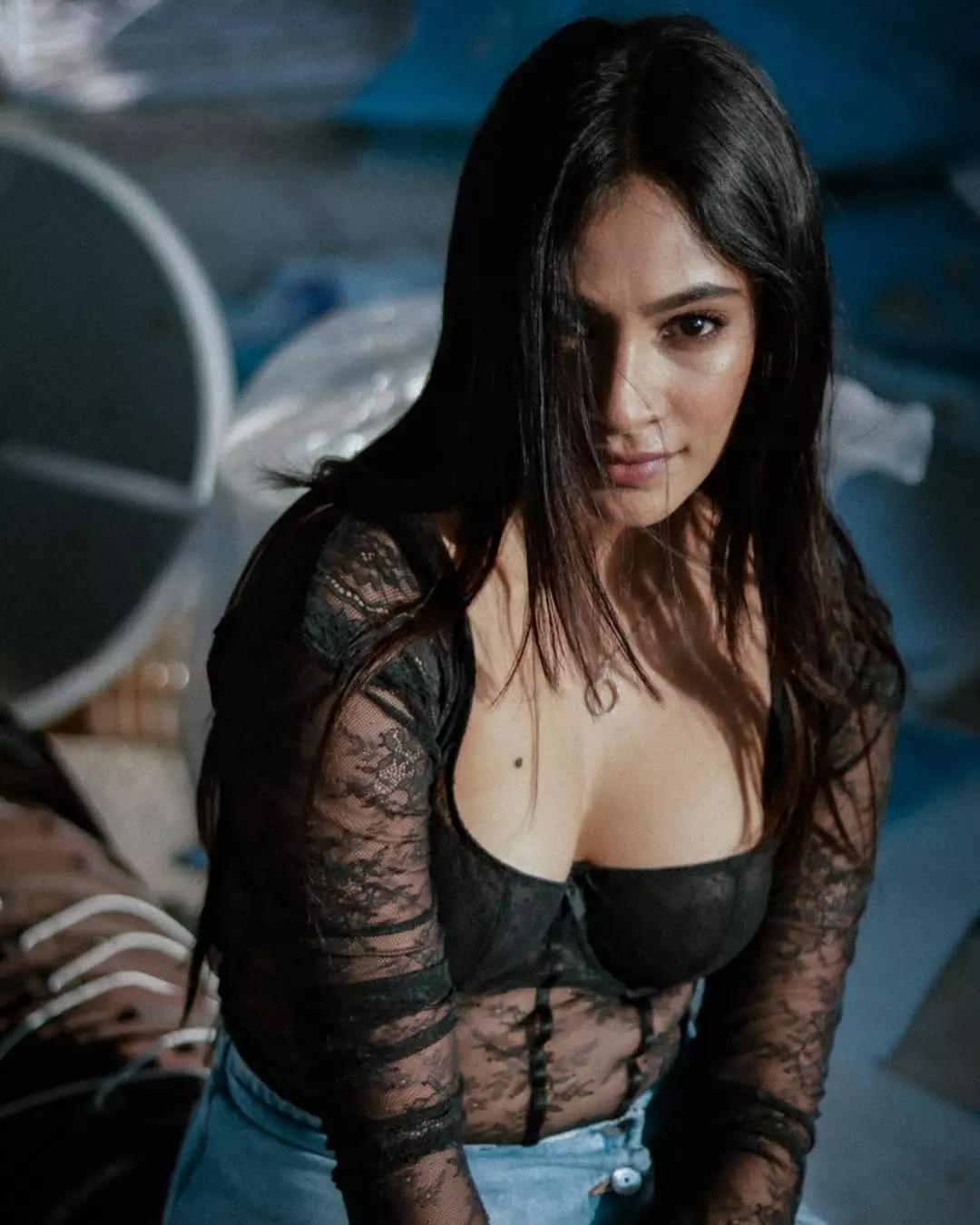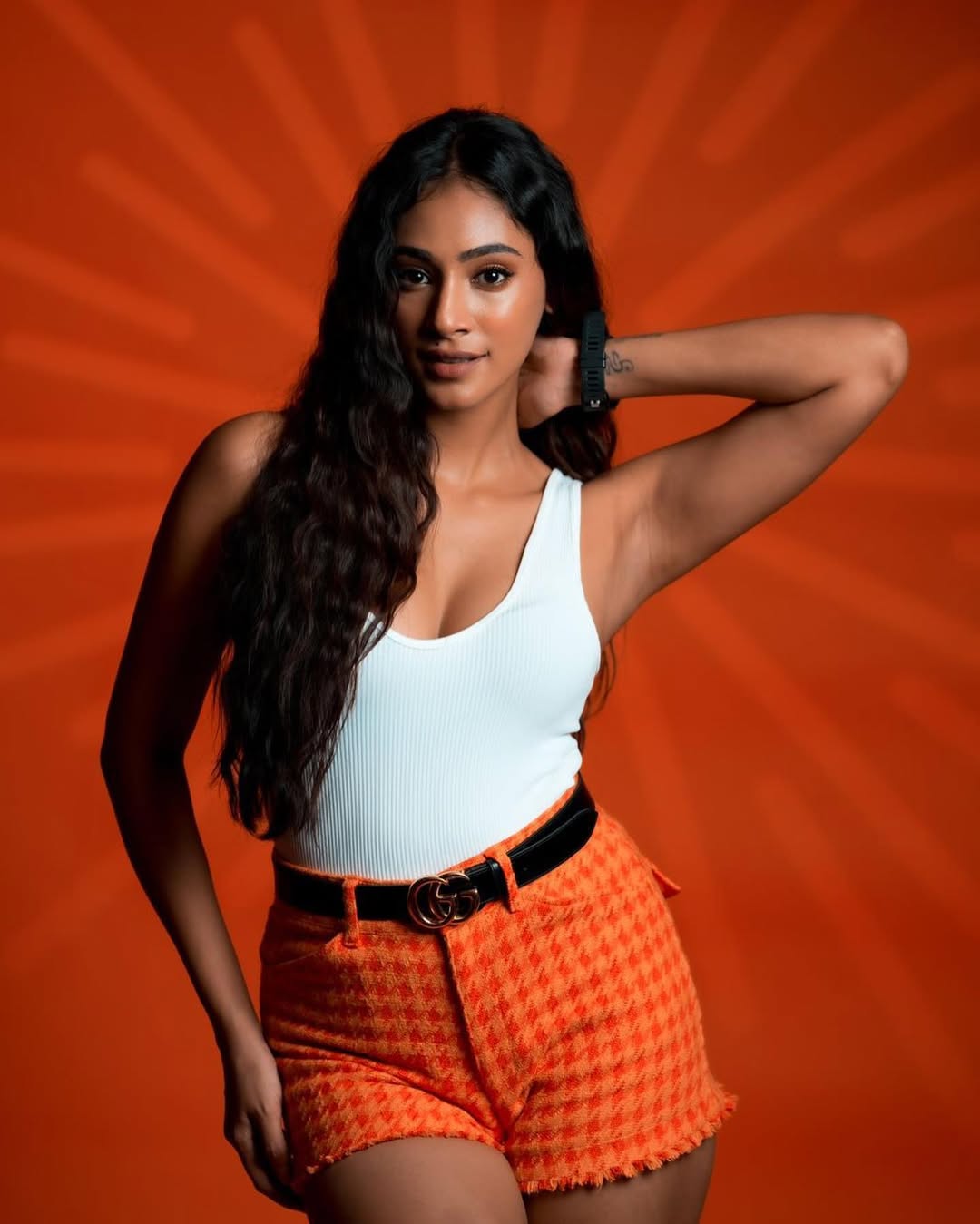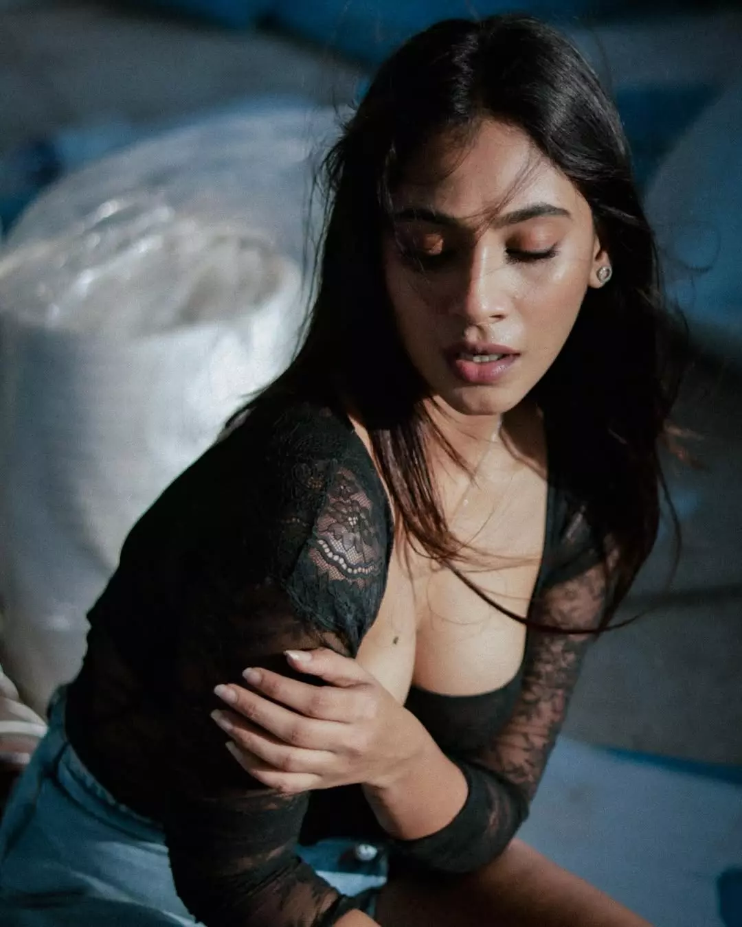 Anukreethy Vas captivates with fierce glamour in this bold photoshoot, reclining against a neutral wall in a black triangle bikini top layered under a vibrant red leather jacket