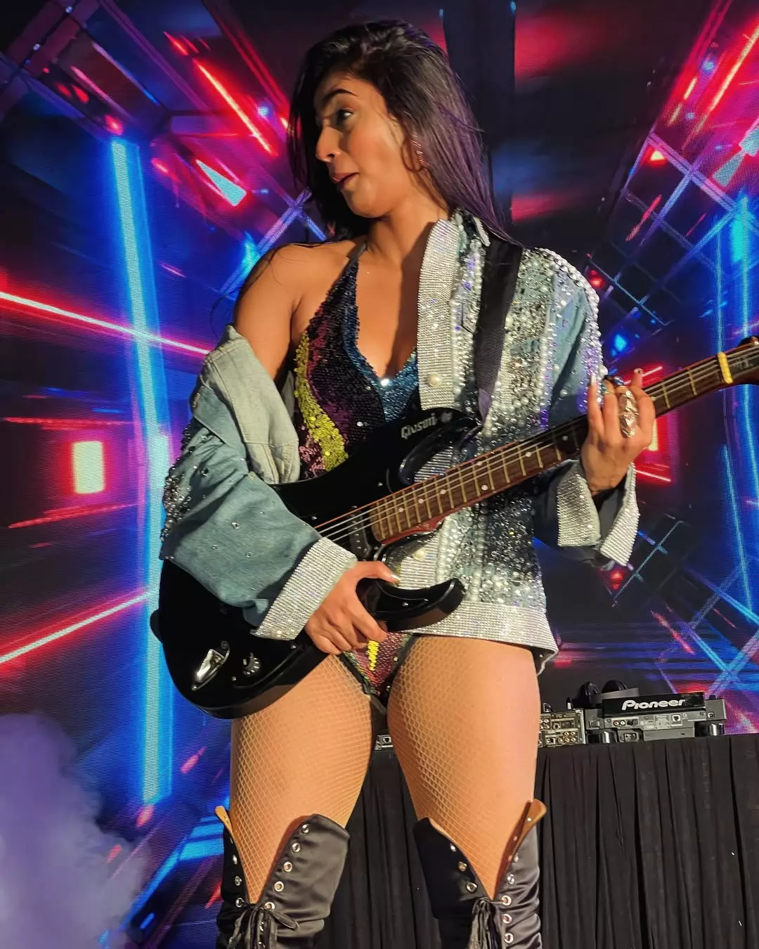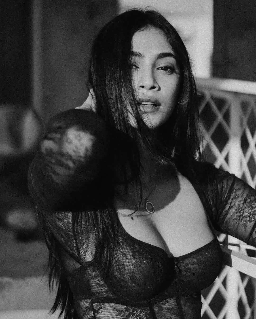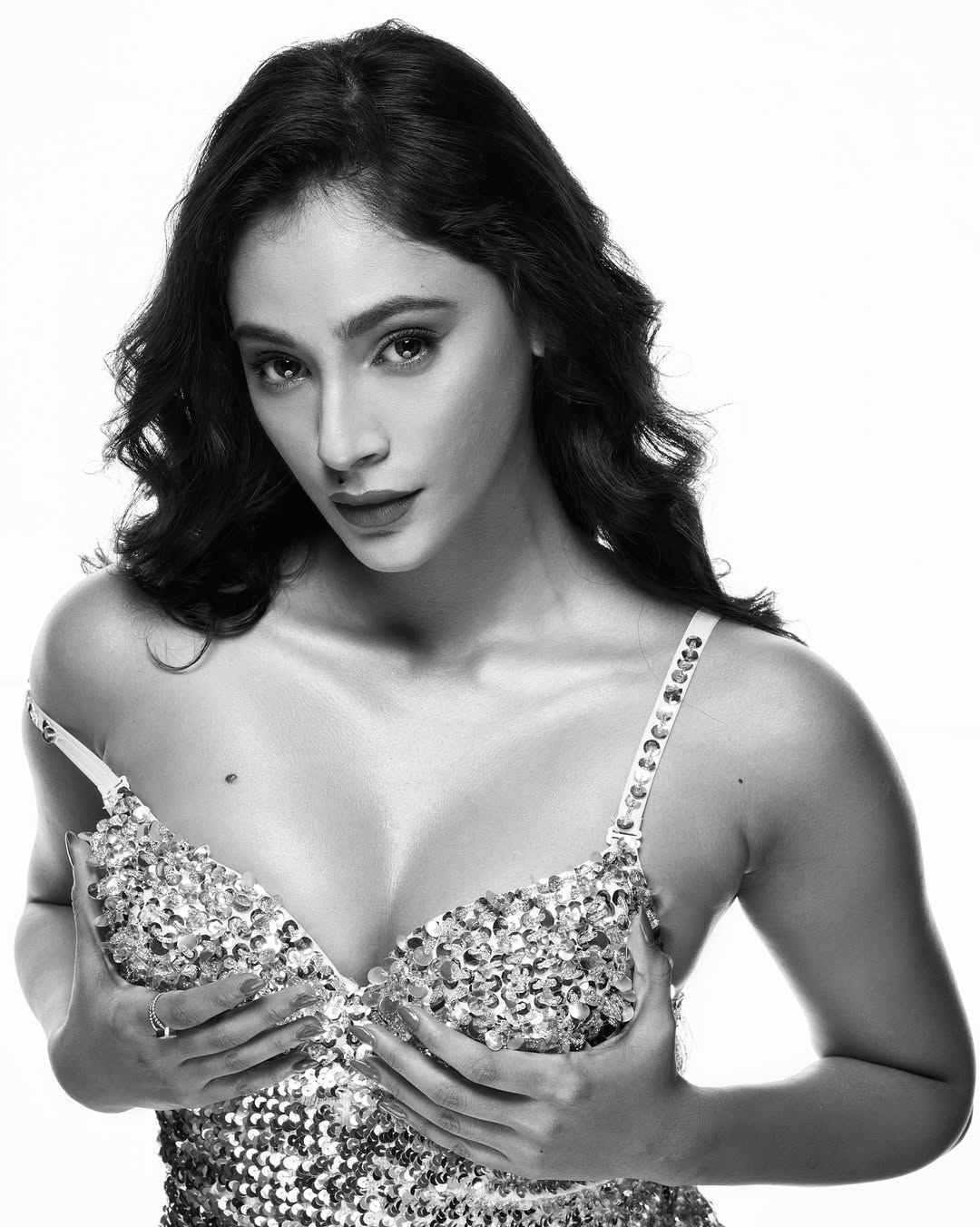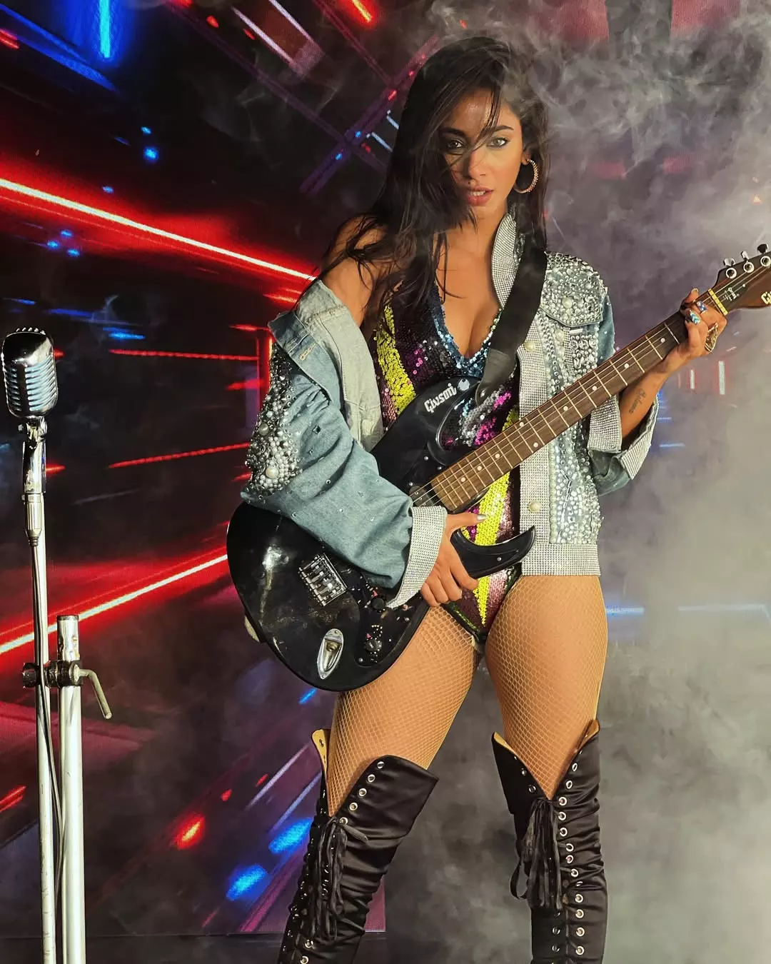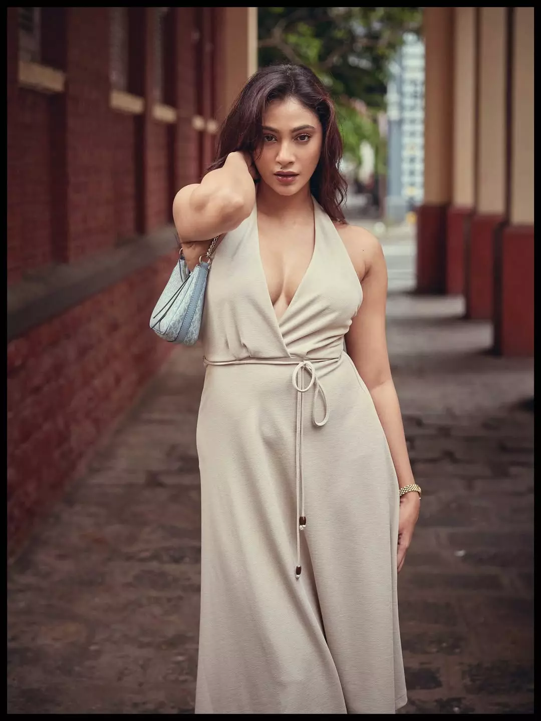 Anukreethy Vas captivates with fierce glamour in this bold photoshoot, reclining against a neutral wall in a black triangle bikini top layered under a vibrant red leather jacket