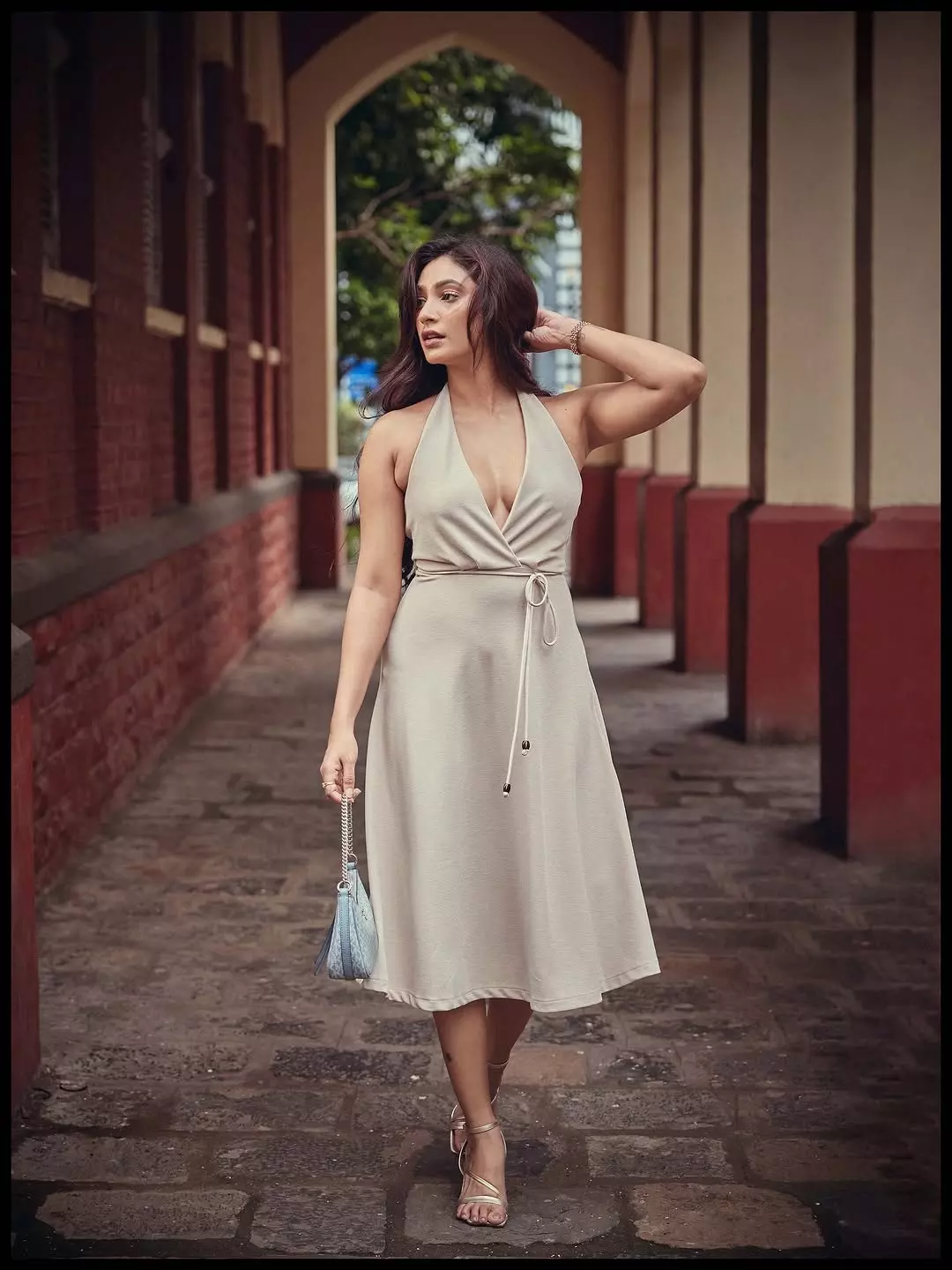 Anukreethy Vas glides under colonial arches, taupe halter midi wrapping like desert wind while gold strappy heels click against wet stone.