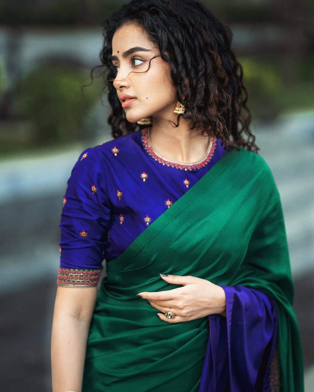 Indian actress Anupama Parameswaran looked radiant in a stunning blue blouse paired with a vibrant green saree, effortlessly blending traditional charm with modern elegance. The intricately embroidered blouse perfectly complemented the saree, highlighting her impeccable style and graceful demeanor. Known for her work in Malayalam and Telugu cinema, Anupama has won fans’ hearts not only with her acting talent but also her refined fashion sense.