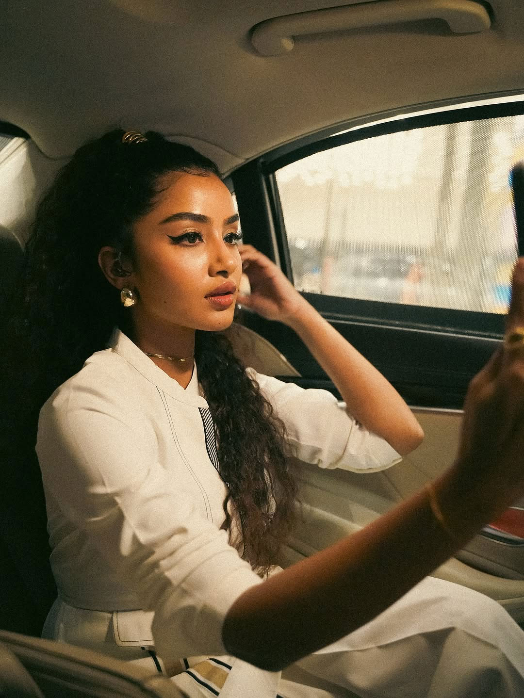 In the photo, she�s captured inside a car, exuding elegance and grace as she subtly adjusts her hairstyle.