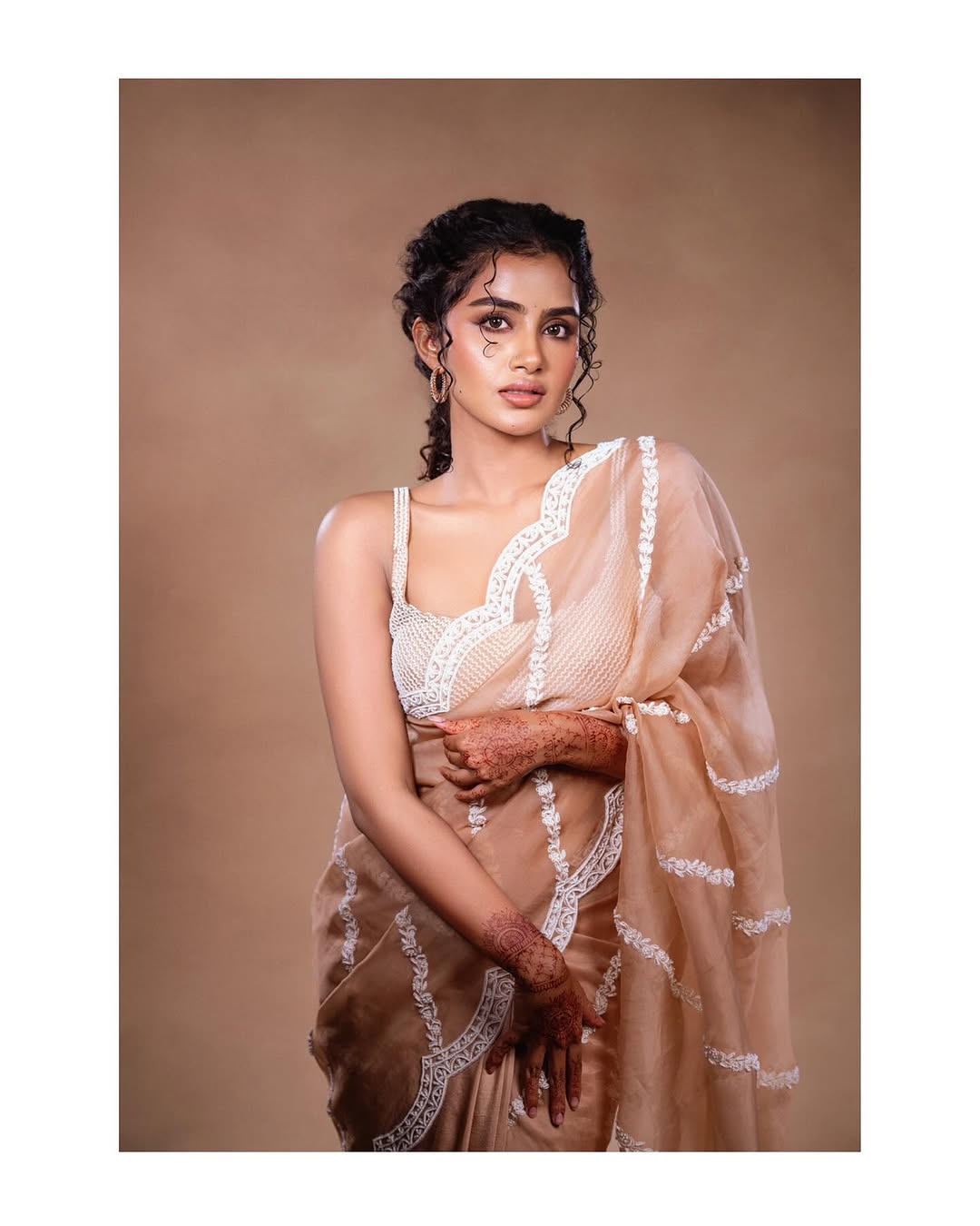 Anupama Parameswaran radiates pure joy in this ethereal portrait, her infectious smile lighting up a soft beige canvas. Draped in a pristine white mulmul ensemble adorned with delicate floral embroidery and intricate lace trims, she embodies timeless grace. Loose curls frame her glowing face, accentuated by a subtle bindi and ornate silver jewelry from Sangeeta Boochra. Leaning playfully with one hand propping her chin, she exudes warmth and serenity — a true Nenjam moment. Styled by @poojakaranam, Outfit @shopmulmul, Jewellery @sangeetaboochra, Shot by @sandeep_fp, Styling team @_kashishjainnn @keerthi.madhusudan.