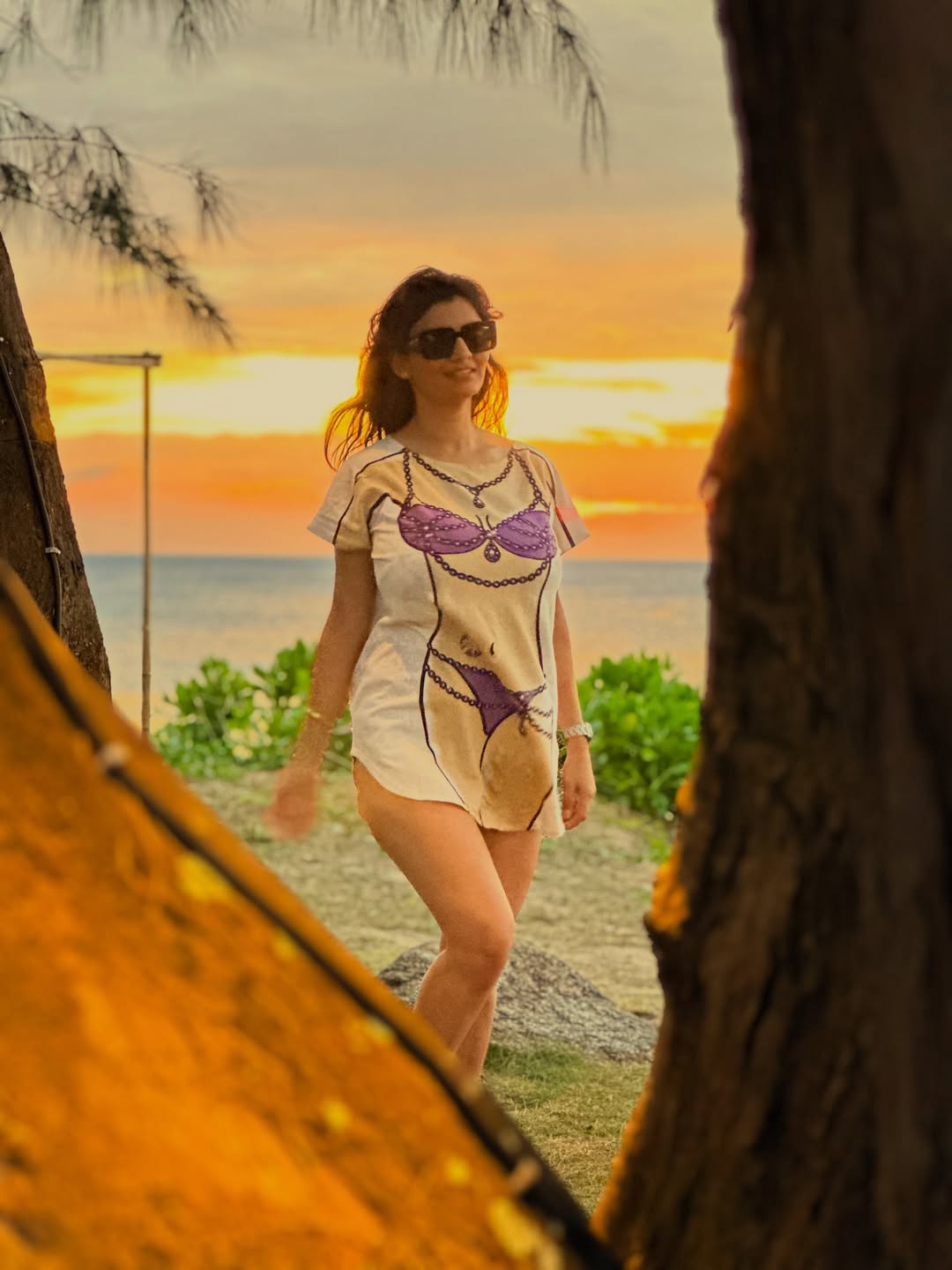 In the photo, Anveshi is seen smiling brightly while standing near the shore. She is wearing a casual white dress with a bold printed design.