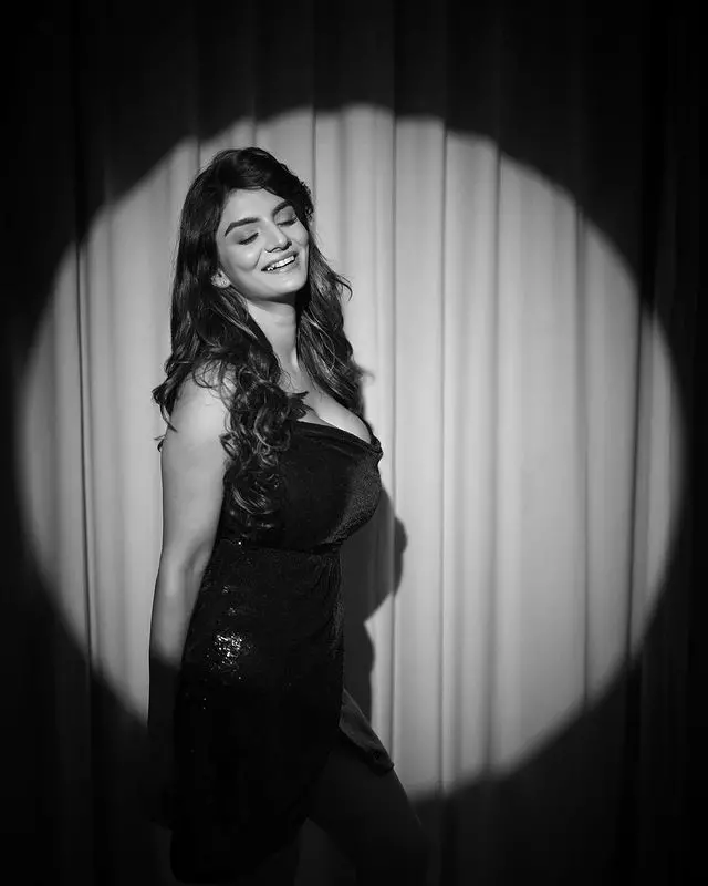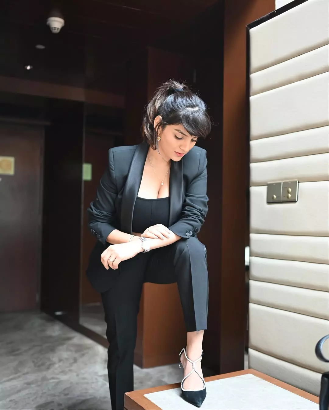 Anveshi Jain exudes confidence and elegance in her latest photodump, donning a chic all-black ensemble that perfectly blends power and style. The tailored blazer paired with a sleek black tube top and high-waist trousers highlights her bold fashion sense, while minimal accessories like a dainty chain, statement earrings, and a luxe wristwatch add just the right touch of sophistication. With her hair tied in a casual ponytail and soft makeup enhancing her natural glow, Anveshi’s look is a flawless example of how to own power dressing with effortless grace.