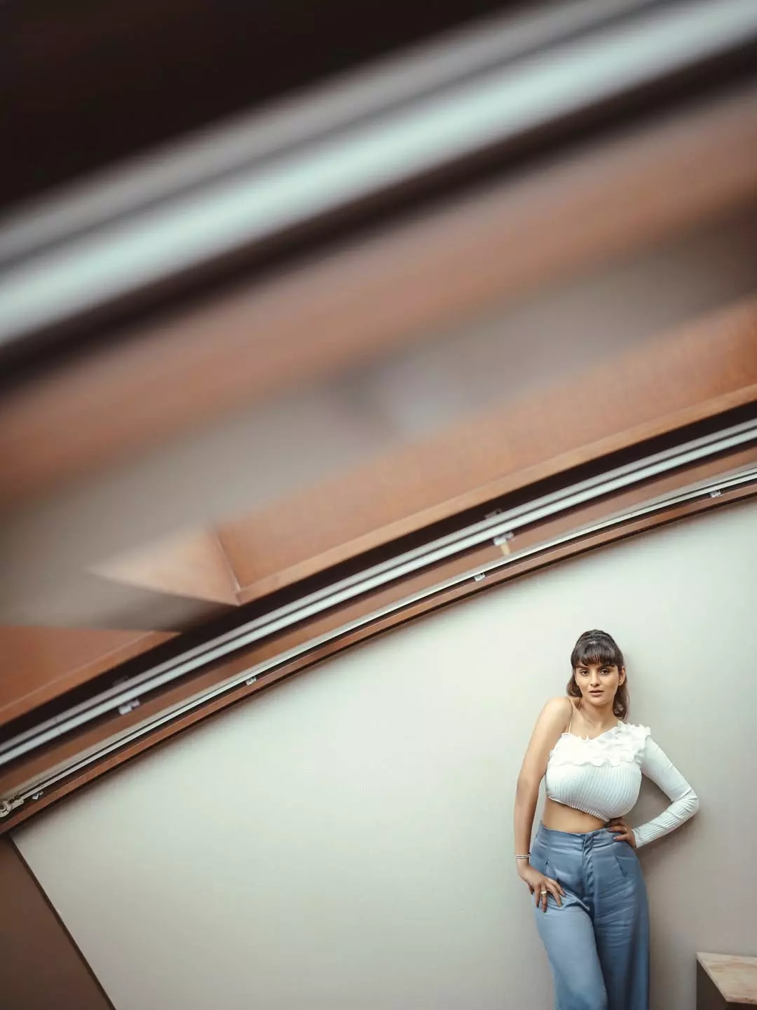 The ensemble’s clean lines and delicate textures bring subtle sophistication, letting Anveshi’s personality shine without distraction. With minimal styling, the look proves the enduring power of simplicity in fashion, showing that sometimes, less truly is more. Her expressions—ranging from soft introspection to confident allure—add layers of depth, transforming each image into a story in itself.