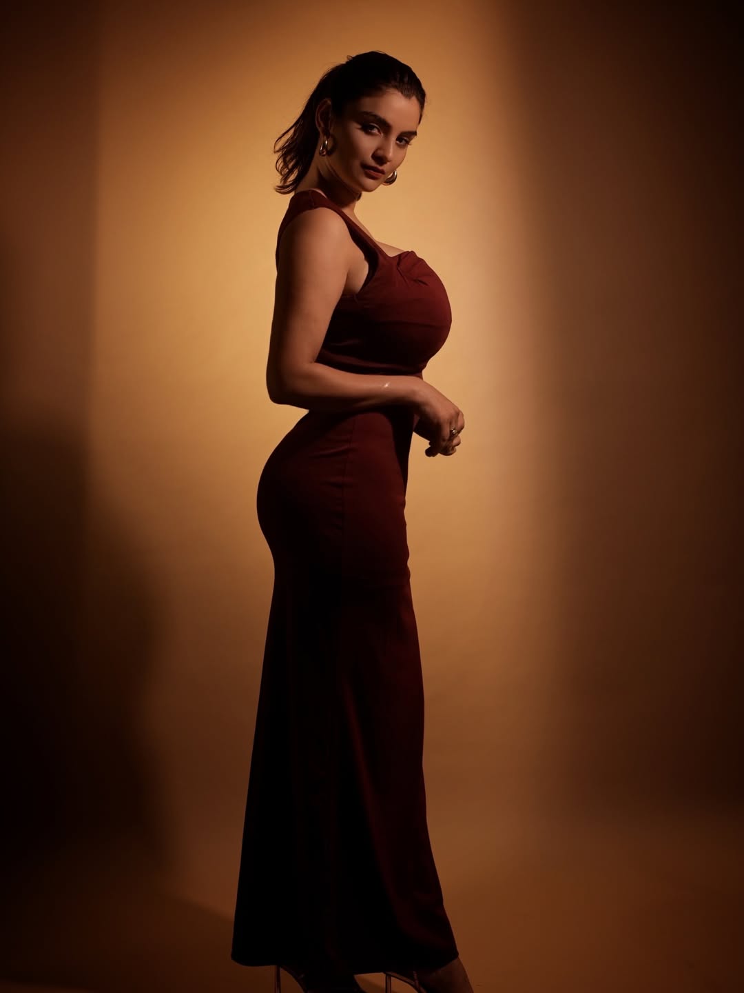 The strapless neckline draws the eye to her shoulders and collarbone, lending a sophisticated and contemporary touch. With its mid-calf length, the midi dress strikes the perfect balance between understated glamour and chic appeal, making it ideal for evening outings or high-fashion shoots. Bodycon designs are crafted to closely follow the body’s contours, creating a flattering, streamlined effect—and Anveshi’s choice exudes both confidence and style.