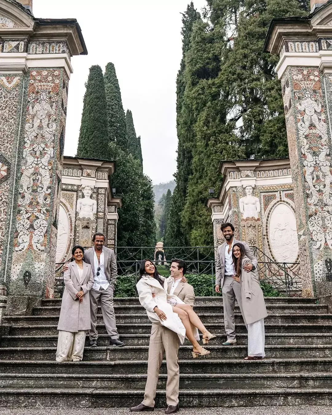 Actor Arjun Sarja’s younger daughter Anjana recently got engaged to her longtime Italian boyfriend in a beautiful and private ceremony at Lake Como, Italy.