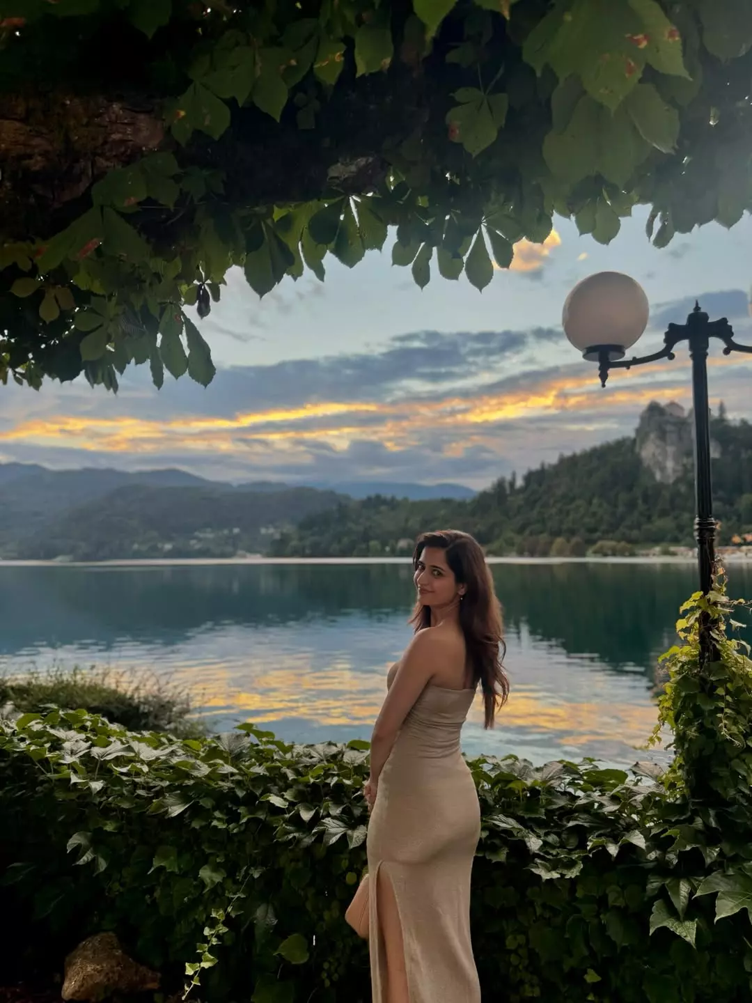 Ashika Ranganath shared a new post on Instagram that captured attention. She stood in front of large glass windows with a scenic lake view behind her. She wore a light golden, strapless, body-fit dress. In the picture, Ashika made a heart shape with her hands near her eyes. She looked happy and relaxed. Her caption read, “Thank you for the love 🤲🎂✨.” She also added the date “05•08•2025 ❤️.”