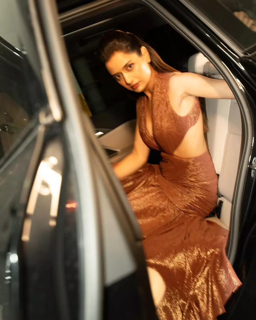 Draped in a molten bronze backless gown that catches light like liquid metal, she keeps everything else bare: sleek high ponytail, barely-there accessories, and a gaze that says everything without trying too hard.
