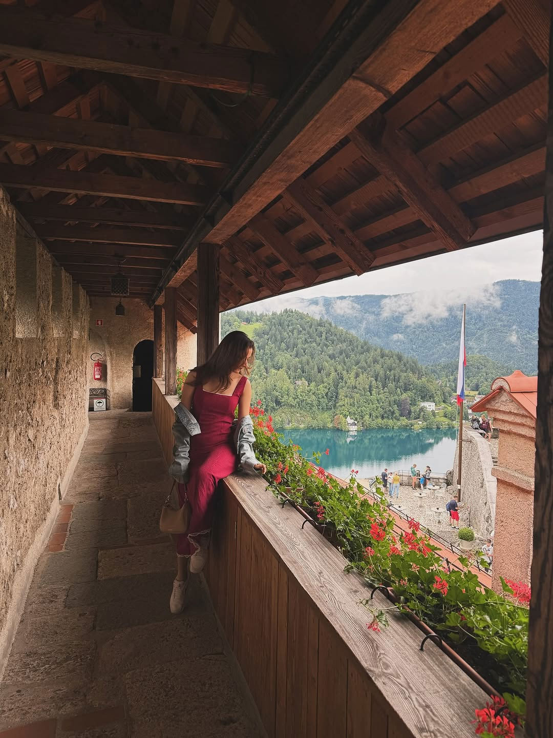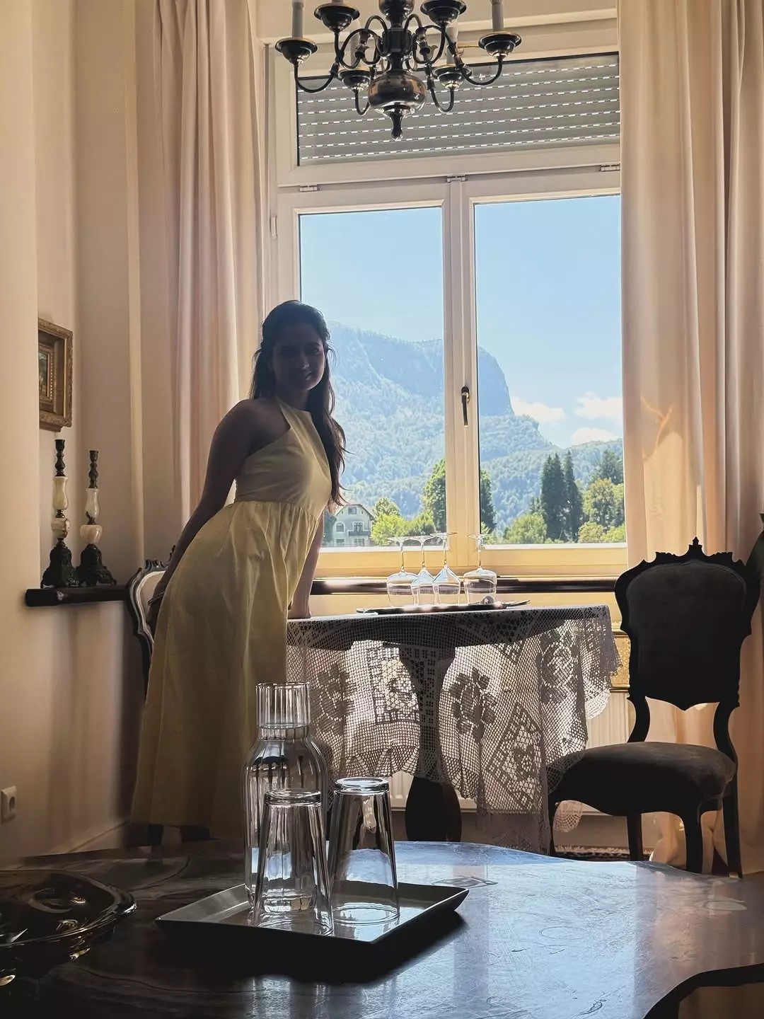 She looks relaxed and graceful in the picture. She stands near a window with a mountain view in the background.