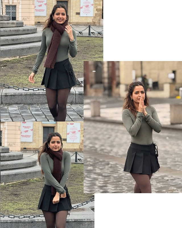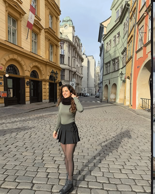 In her latest Instagram post from Prague, Ashika Ranganath is seen posing on a street. She wears a green top, short black skirt, black shoes and sheer stockings. Her caption says "Oh hi, nice to meet you." She adds a maroon scarf to complete the look. Her style looks perfect for the winter streets.