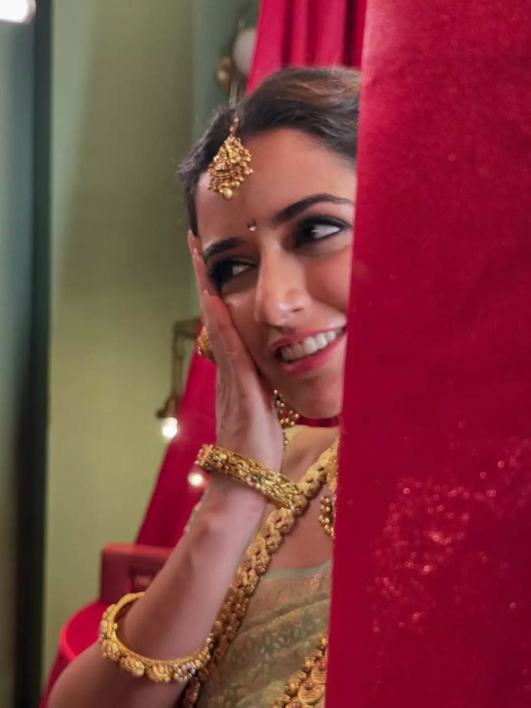 Her saree speaks first. A soft green silk, woven with delicate golden threads, it glows under the warm light of the setting.
