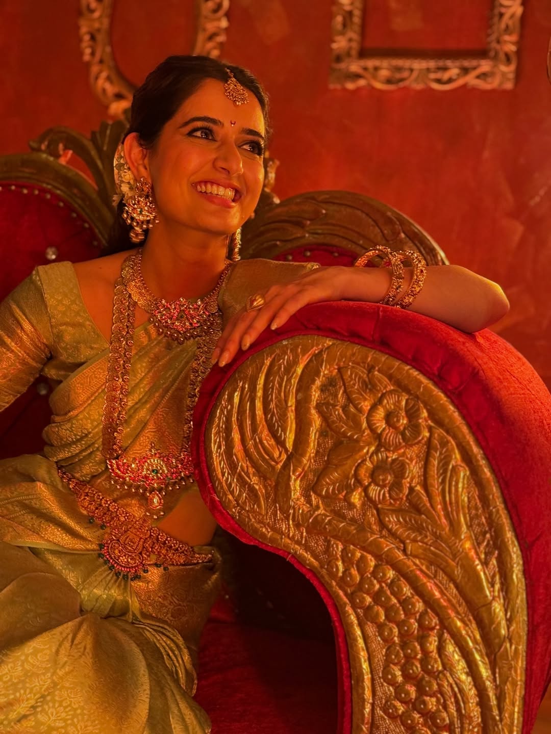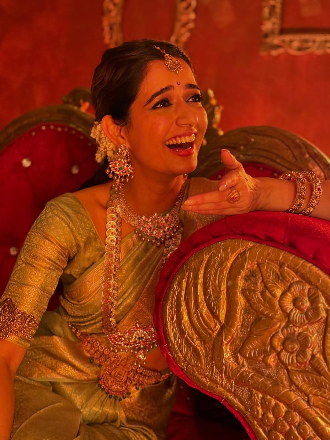 And finally, there is her expression. Ashika is not frozen in a posed smile; instead, she laughs openly, leaning into the chair with ease. That moment of comfort makes the entire look come alive. The silk, the ornaments, the throne, they shine brighter only because her smile carries them. More than styling, it is this warmth that channels the Devi energy she spoke of, reminding us that Navratri is as much about inner joy as it is about outer grandeur.