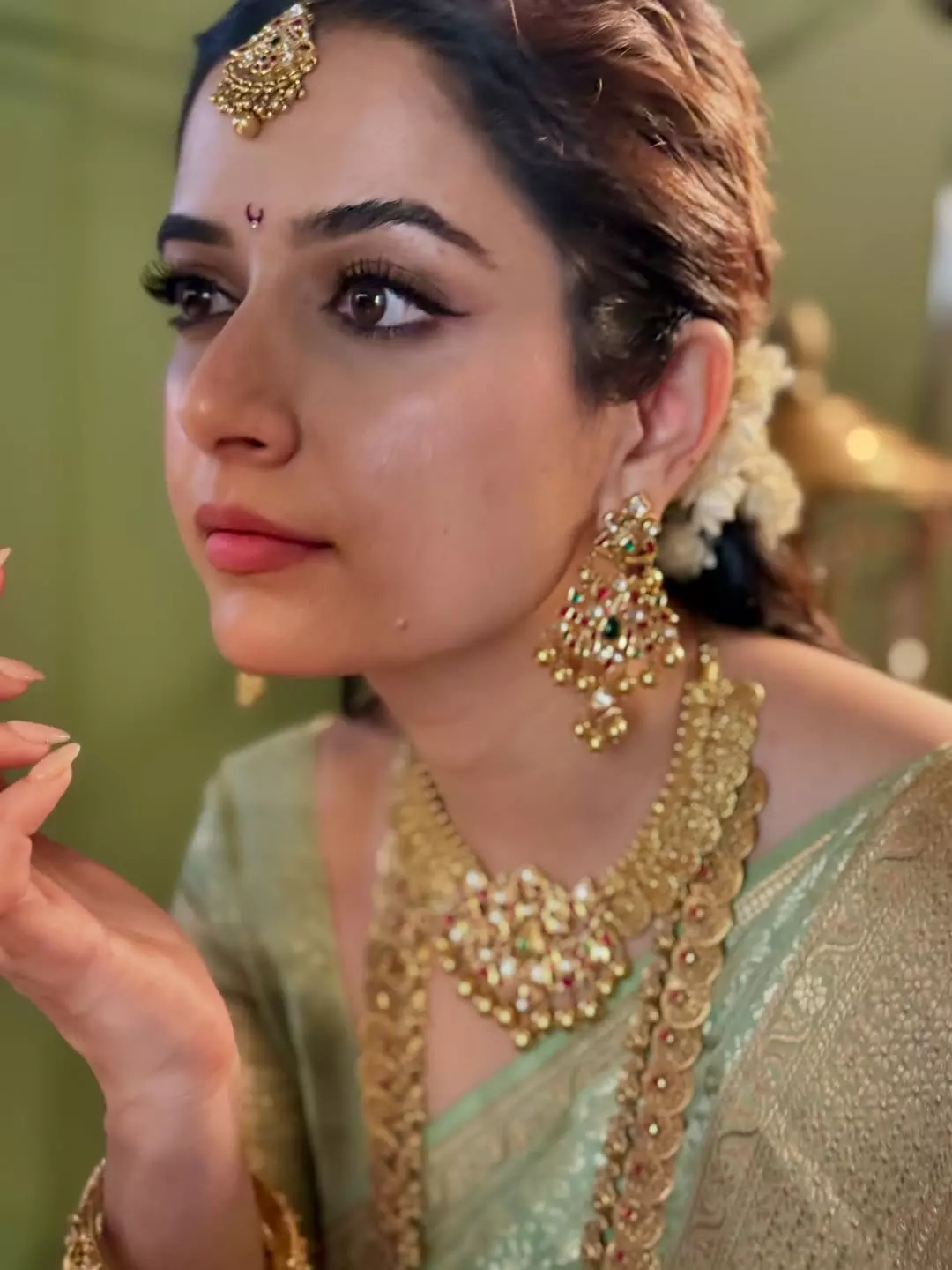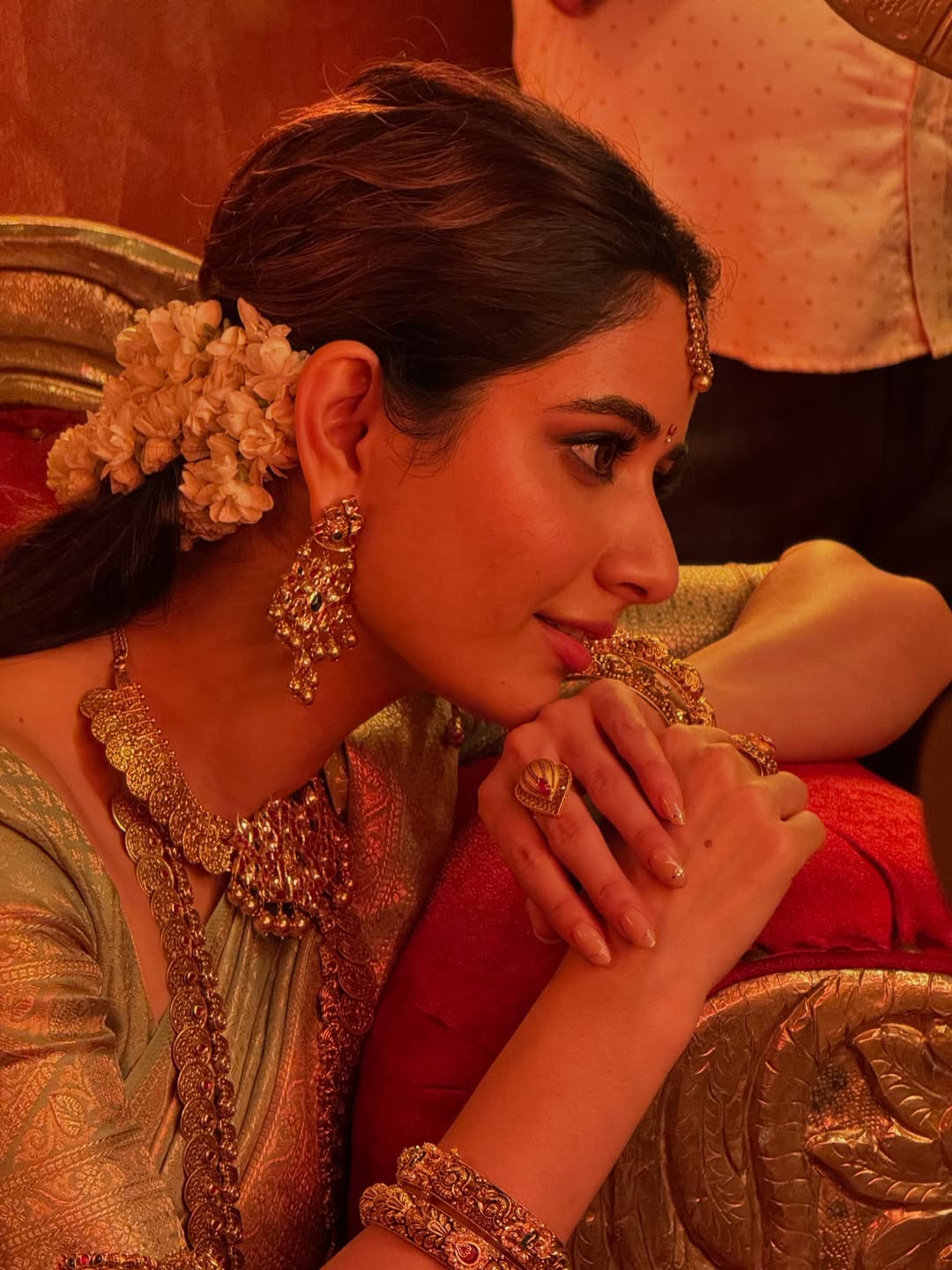 The jewellery then steps forward to complete the story. Heavy necklaces sit on her like temple carvings brought into gold, with rubies and emeralds catching the eye. A broad waistband rests at her waist, giving her the posture of a queen on a throne. The bangles stacked on her wrist, the matha patti on her forehead, and the earrings shaped like little chandeliers—all add layers without feeling crowded. Even the jasmine flowers in her hair play their part, softening the gold with a touch of fragrance and memory.