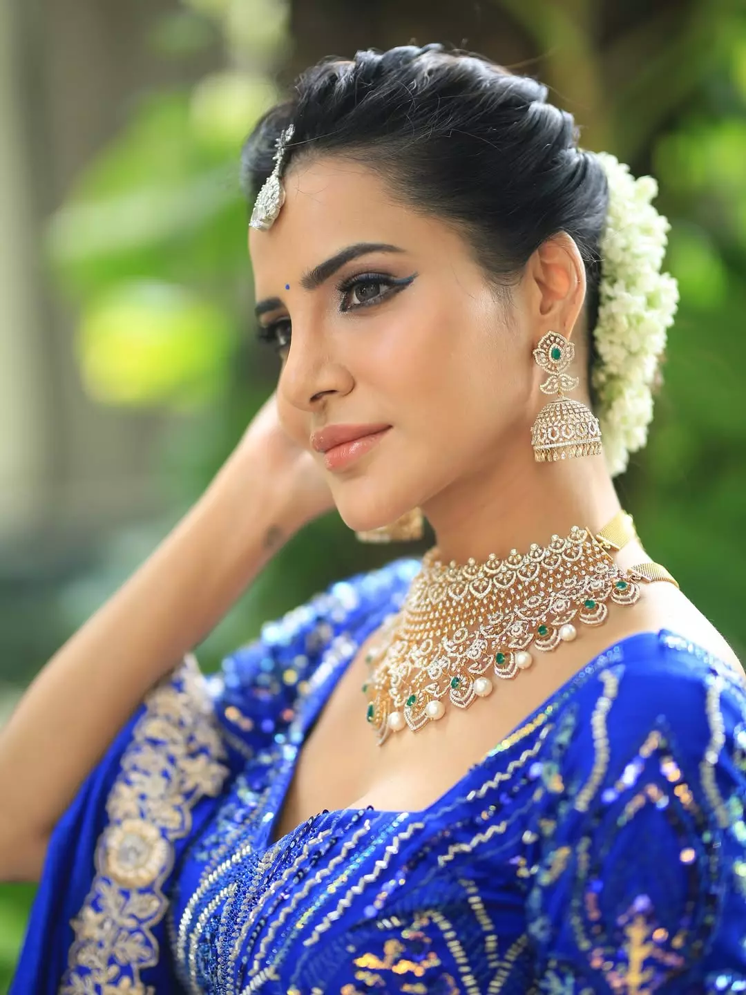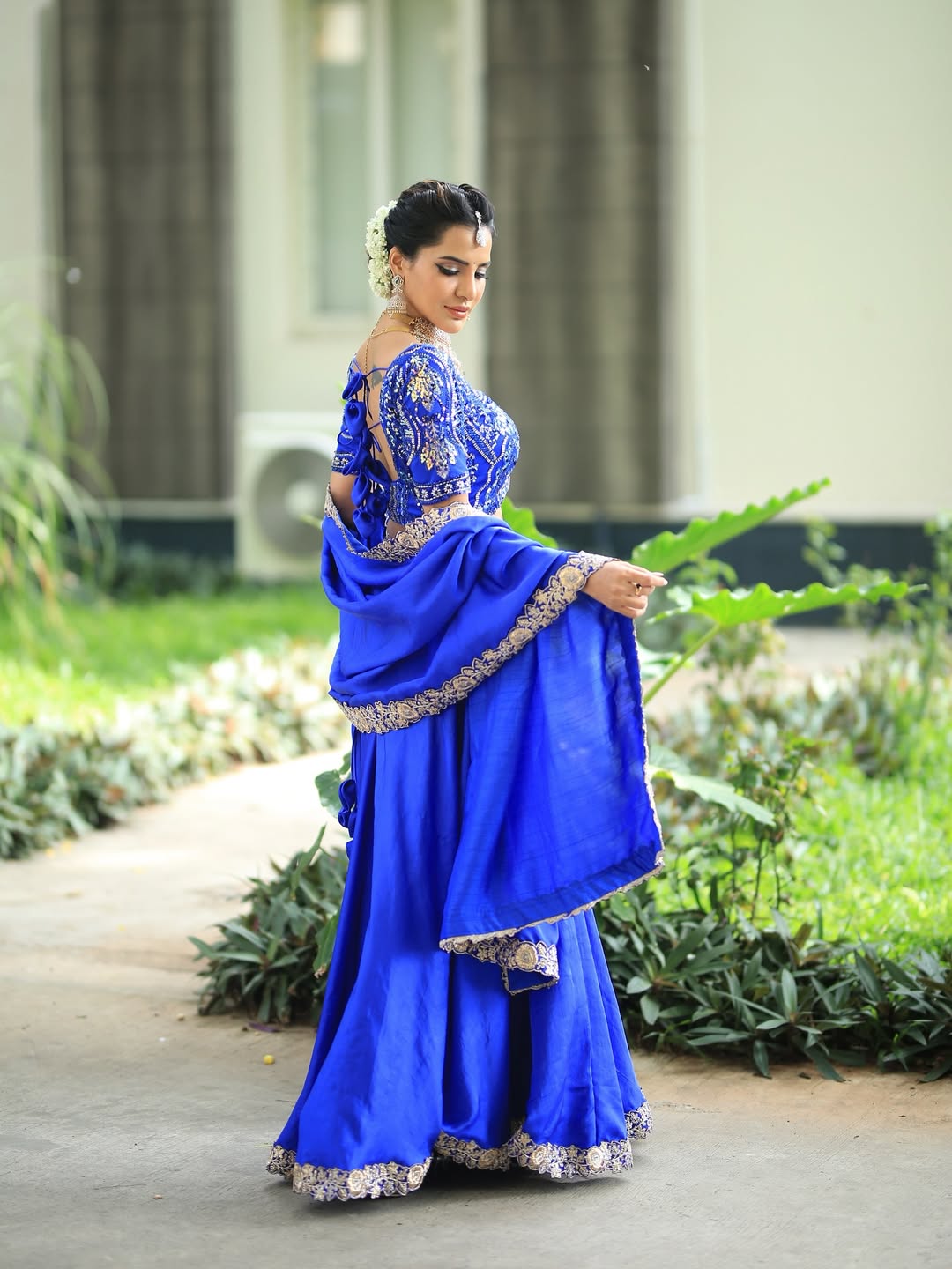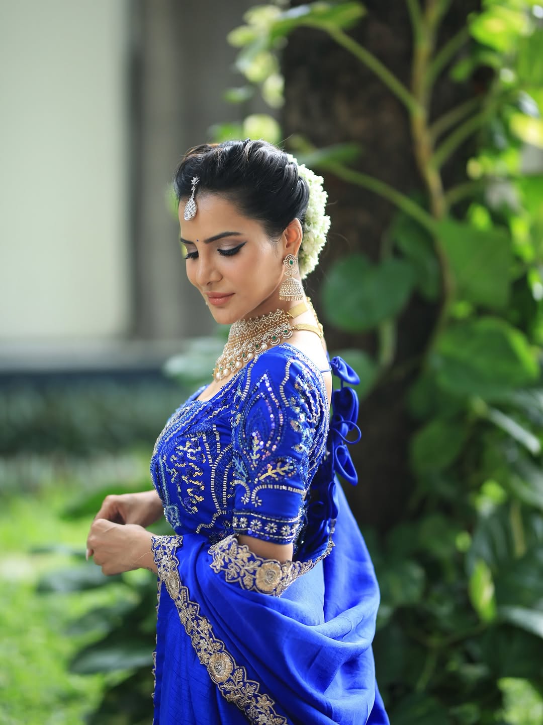 Ashu Reddy has once again captured attention with her royal blue ensemble by showcasing a perfect blend of traditional elegance and modern charm. In this picture, she looks graceful in a royal blue lehenga set. The intricate embellishments on her dress combined with a delicate choker necklace, enhance the beauty of her look by making it both sophisticated and glamorous.