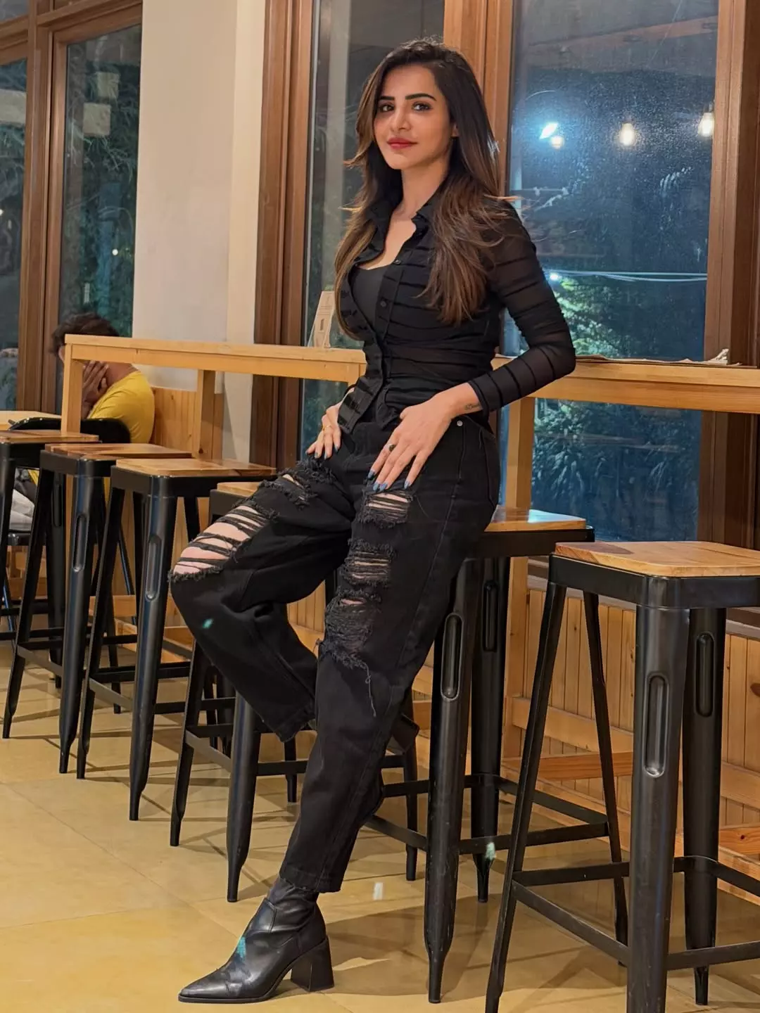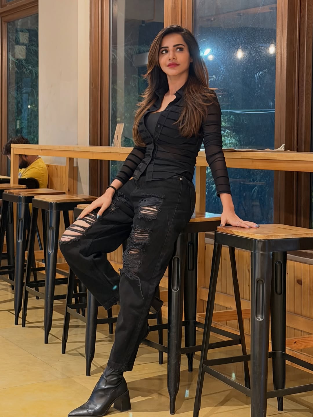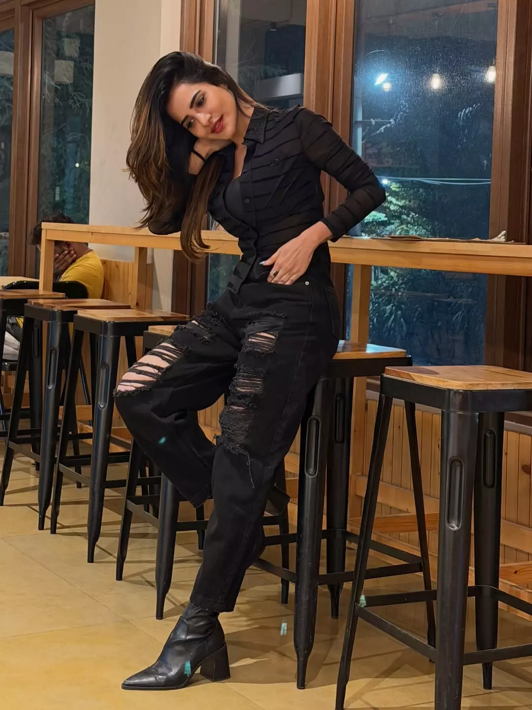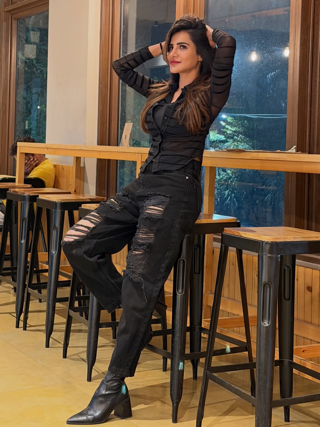 In the post, she turned heads in an all-black ensemble, pairing a sheer-sleeved top with heavily distressed jeans, and finishing the edgy outfit with sleek black ankle boots. The ensemble showcased her fashion-forward sensibility while highlighting the effortless charm that has become her trademark. Her confident pose and radiant expression reinforced why she commands such a loyal fan following on social media.
