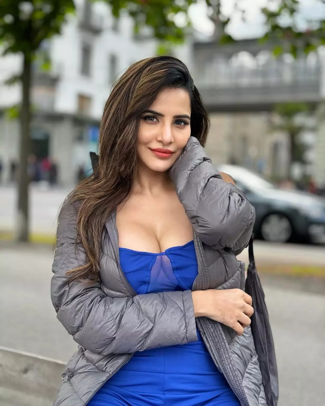 Ashu Reddy, a stunning Telugu actress and social media sensation, captivates fans with her glamorous photoshoots and confident style. In this striking image, she exudes elegance in a bold blue off-shoulder top paired with a cozy grey puffer jacket, posing gracefully against an urban backdrop with trees and architecture. Her expressive gaze, flawless makeup, and radiant smile highlight her natural charm and poise, making her a favorite for fashion and lifestyle content.