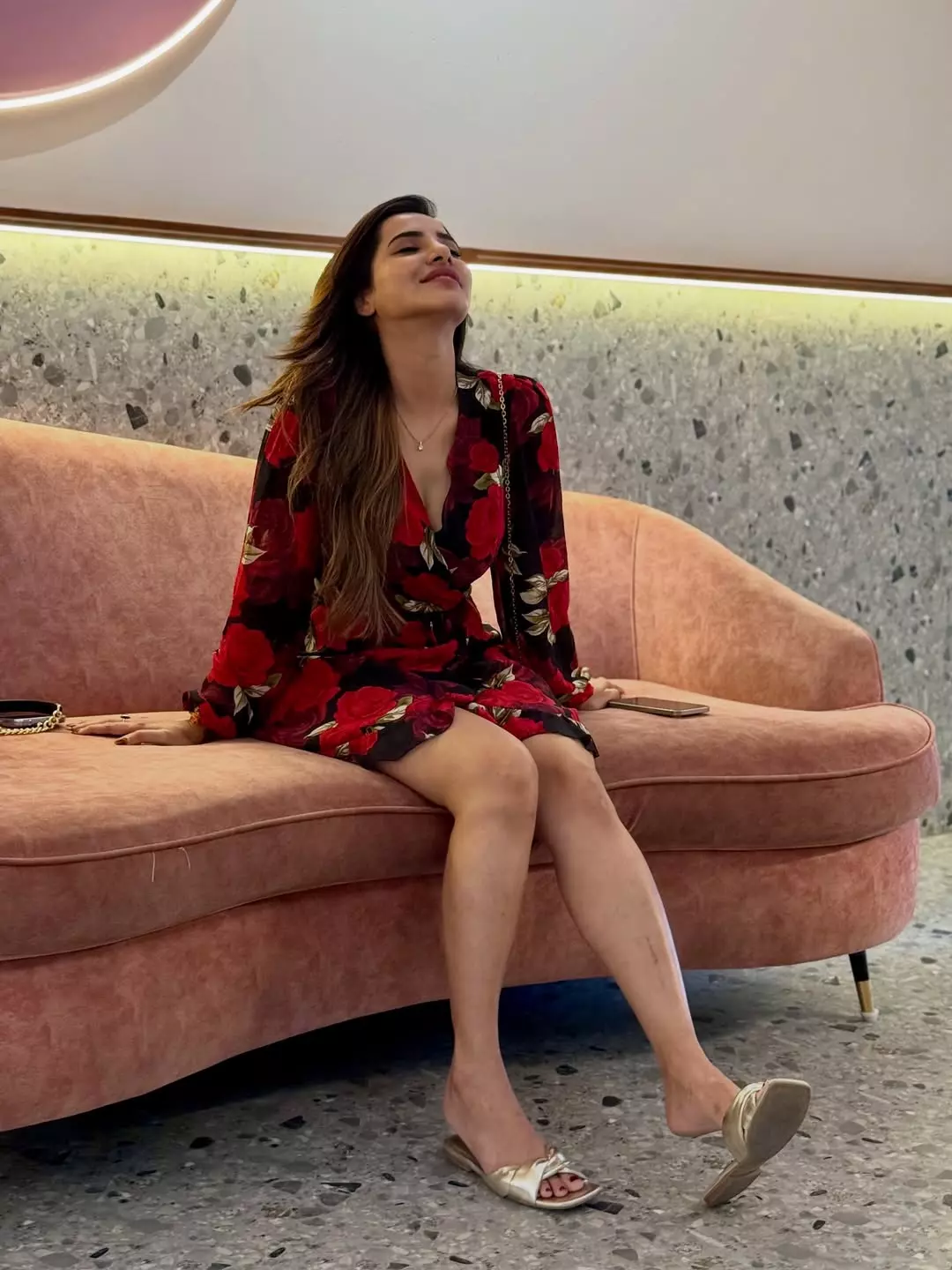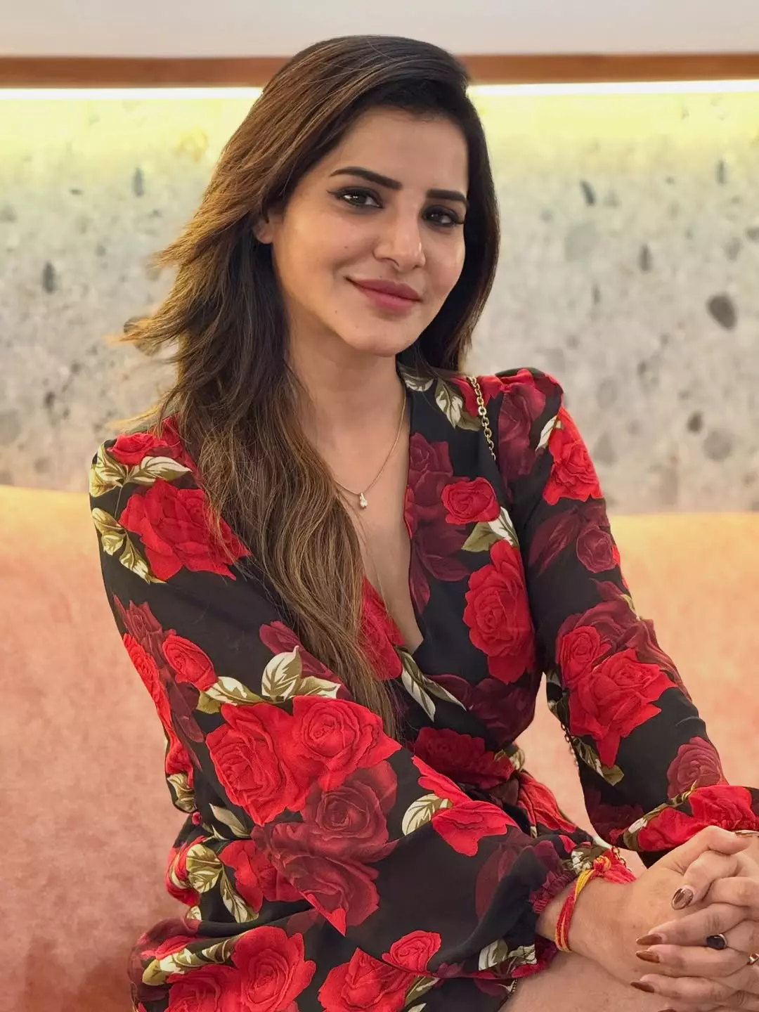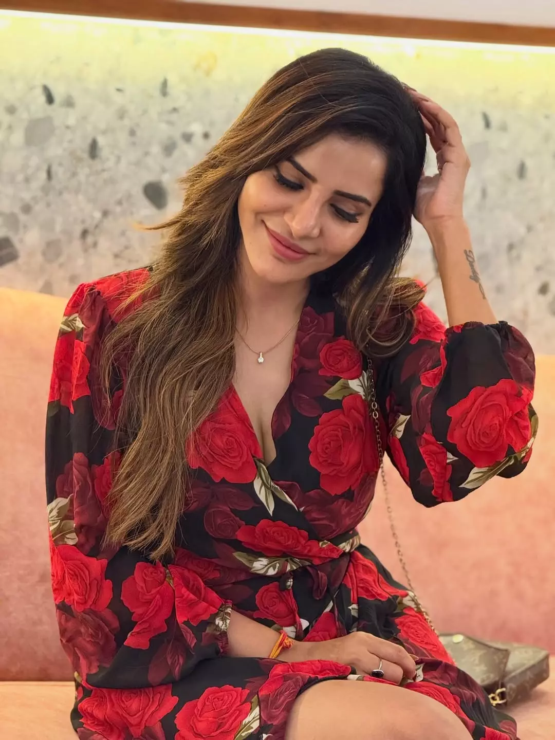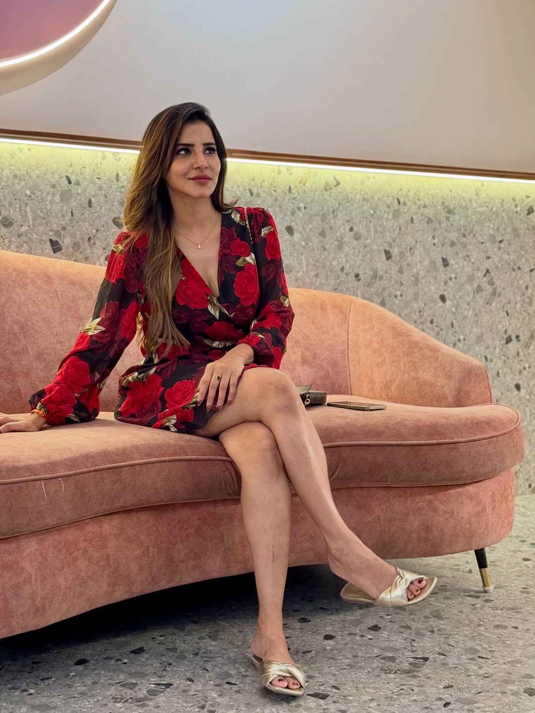 In the picture, Ashu appears relaxed and radiant, wearing a red dress covered with rose prints, which adds a touch of glamour to her look.