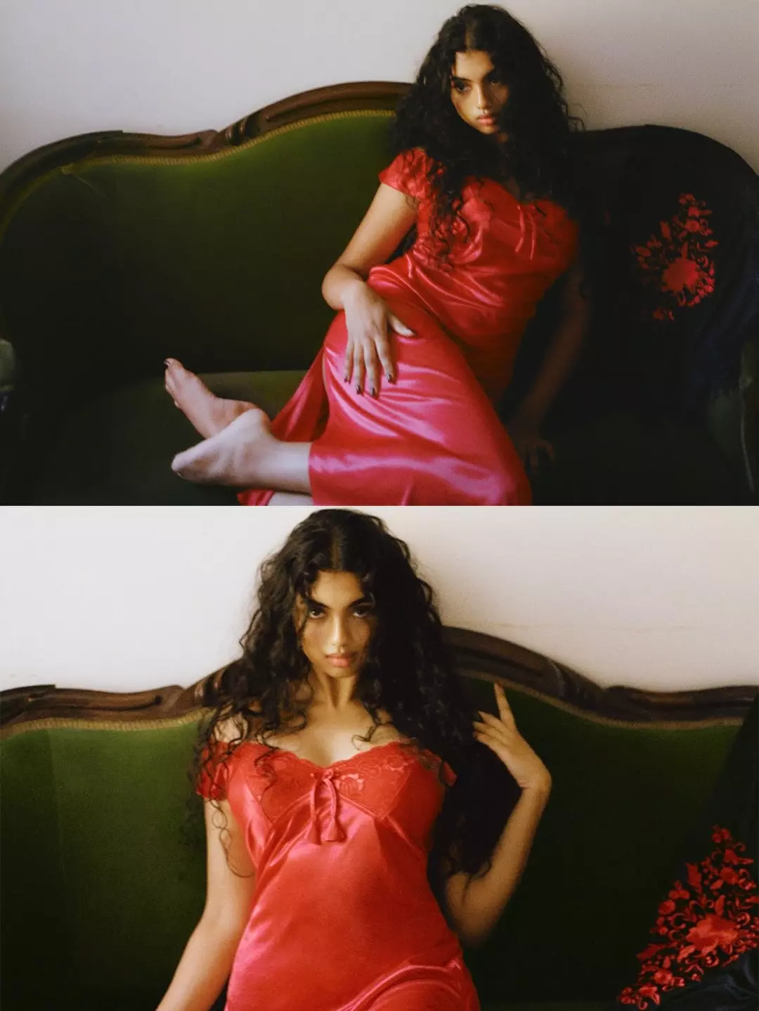 The dress, crafted from a lightweight satin or silk-blend fabric, features a bodycon or slip-style silhouette that subtly accentuates her figure while flowing gracefully with a soft sheen.