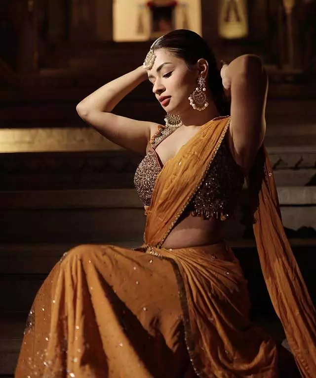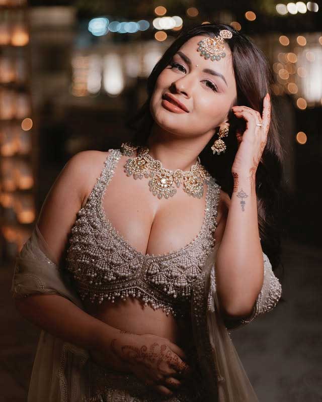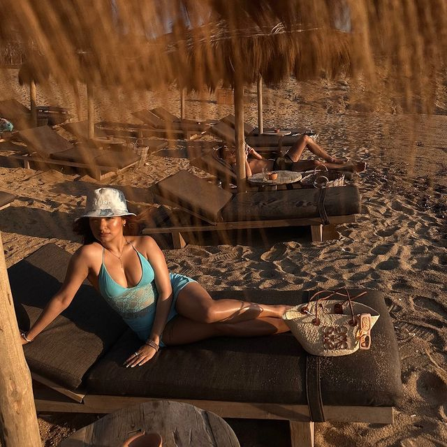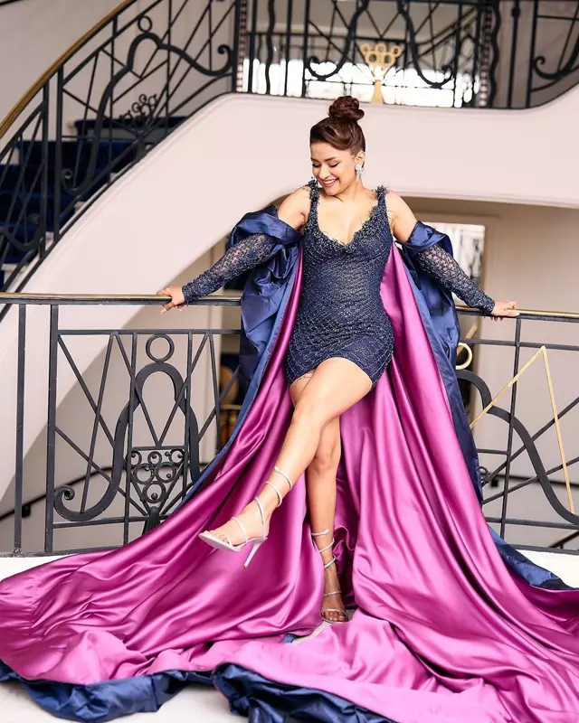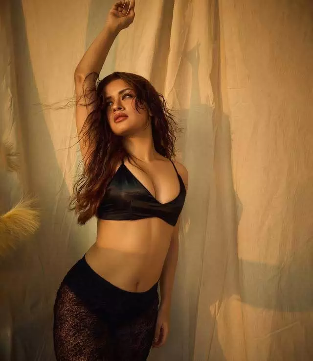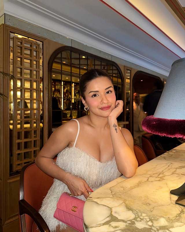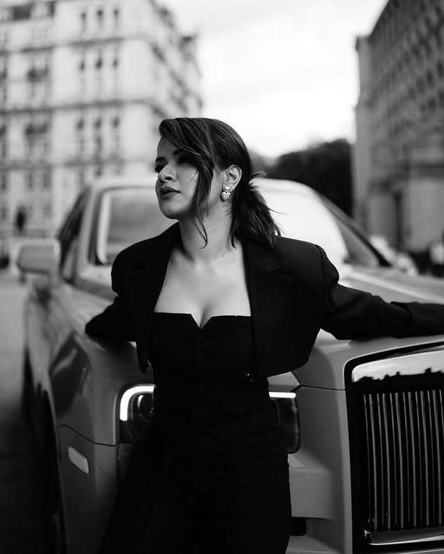 The dramatic composition highlights her poised elegance, intense gaze, and effortless sensuality, making it a standout in her glamorous photo collections that blend bold fashion with poetic mystery.
