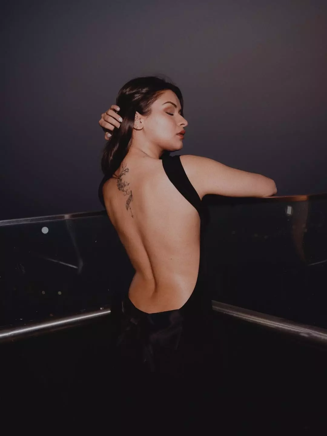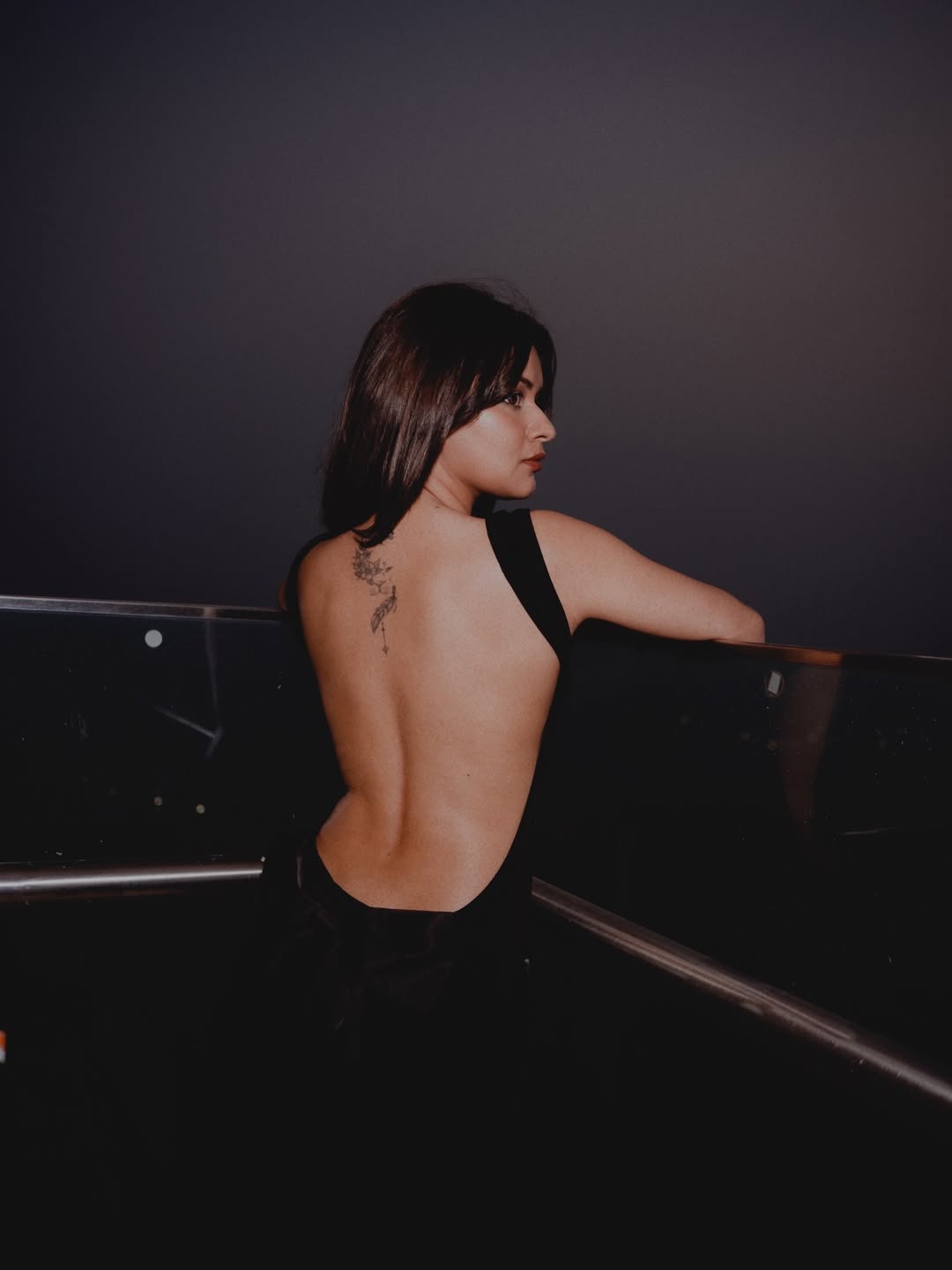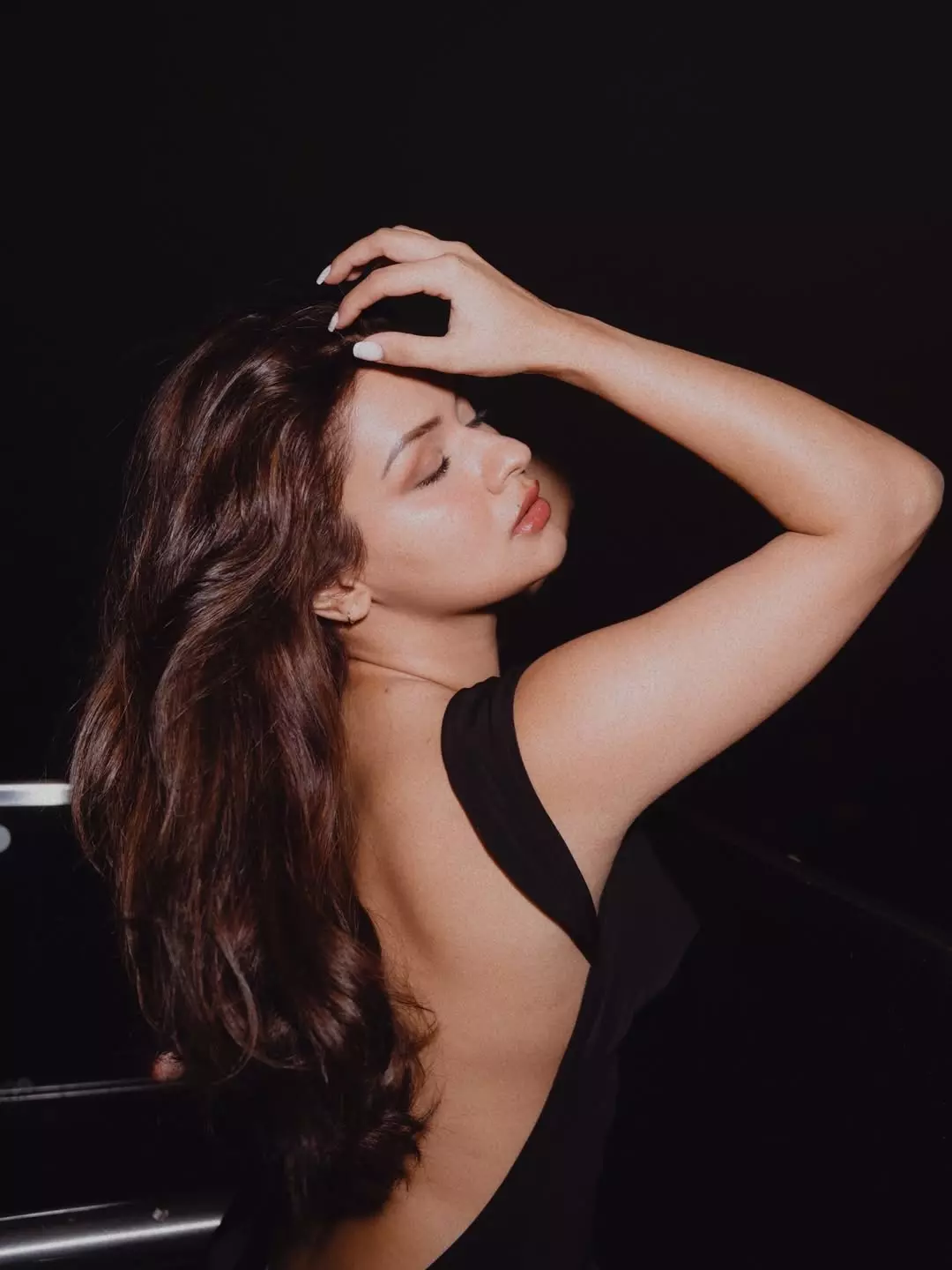 The dramatic composition highlights her poised elegance, intense gaze, and effortless sensuality, making it a standout in her glamorous photo collections that blend bold fashion with poetic mystery.
