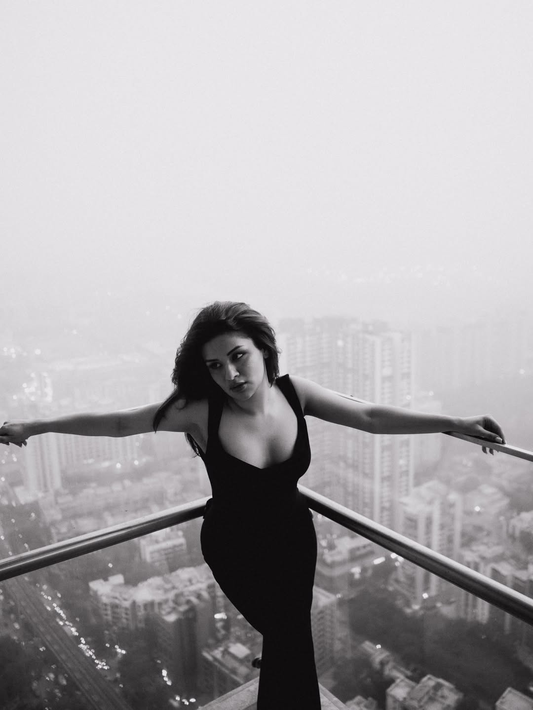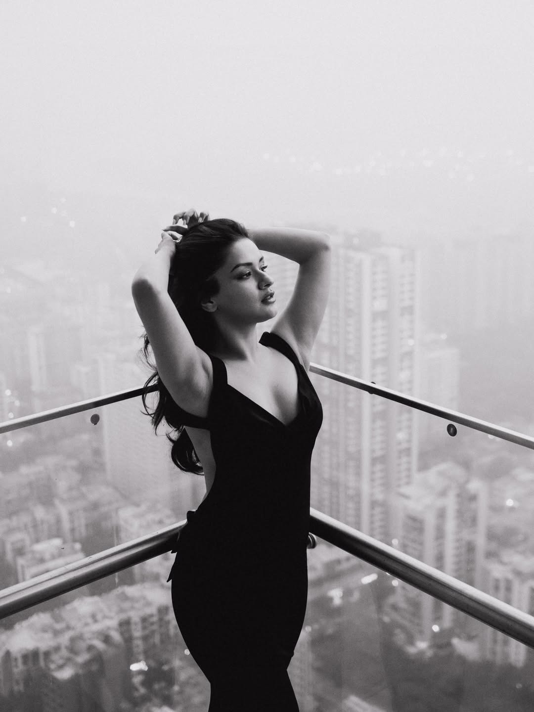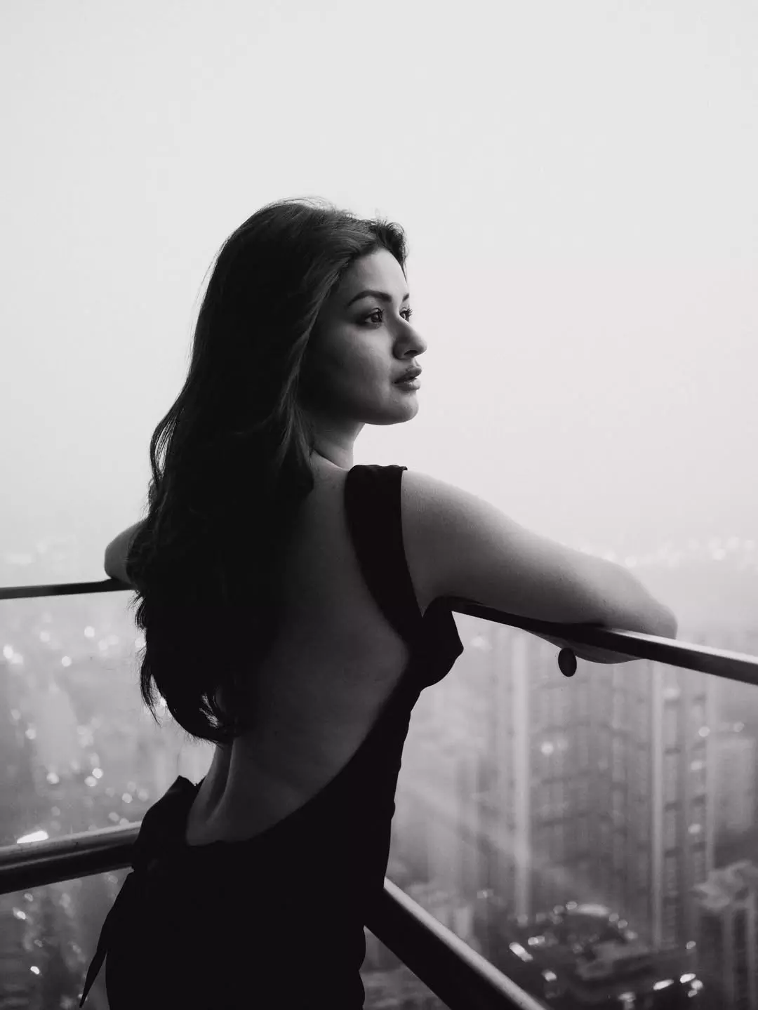 Avneet Kaur captivates in this mesmerizing black-and-white photo, striking a mystical pose on a high-rise balcony with the city skyline shrouded in fog. She stands in a sleek black dress, hands gracefully raised to her flowing hair, exuding an enigmatic allureClick @dieppj.