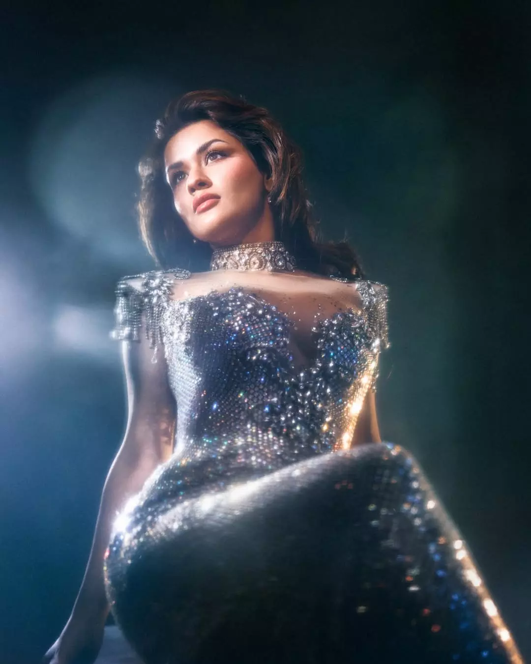 Avneet Kaur just turned into a walking constellation in this jaw-dropping silver crystal-embellished gown that catches light from every angle. The dramatic shoulder detailing, plunging neckline, and that sleek wet-look hair paired with a fierce gaze make her look like she descended straight from the galaxy. Diamonds in the sky Wearing @jolipoli.couture