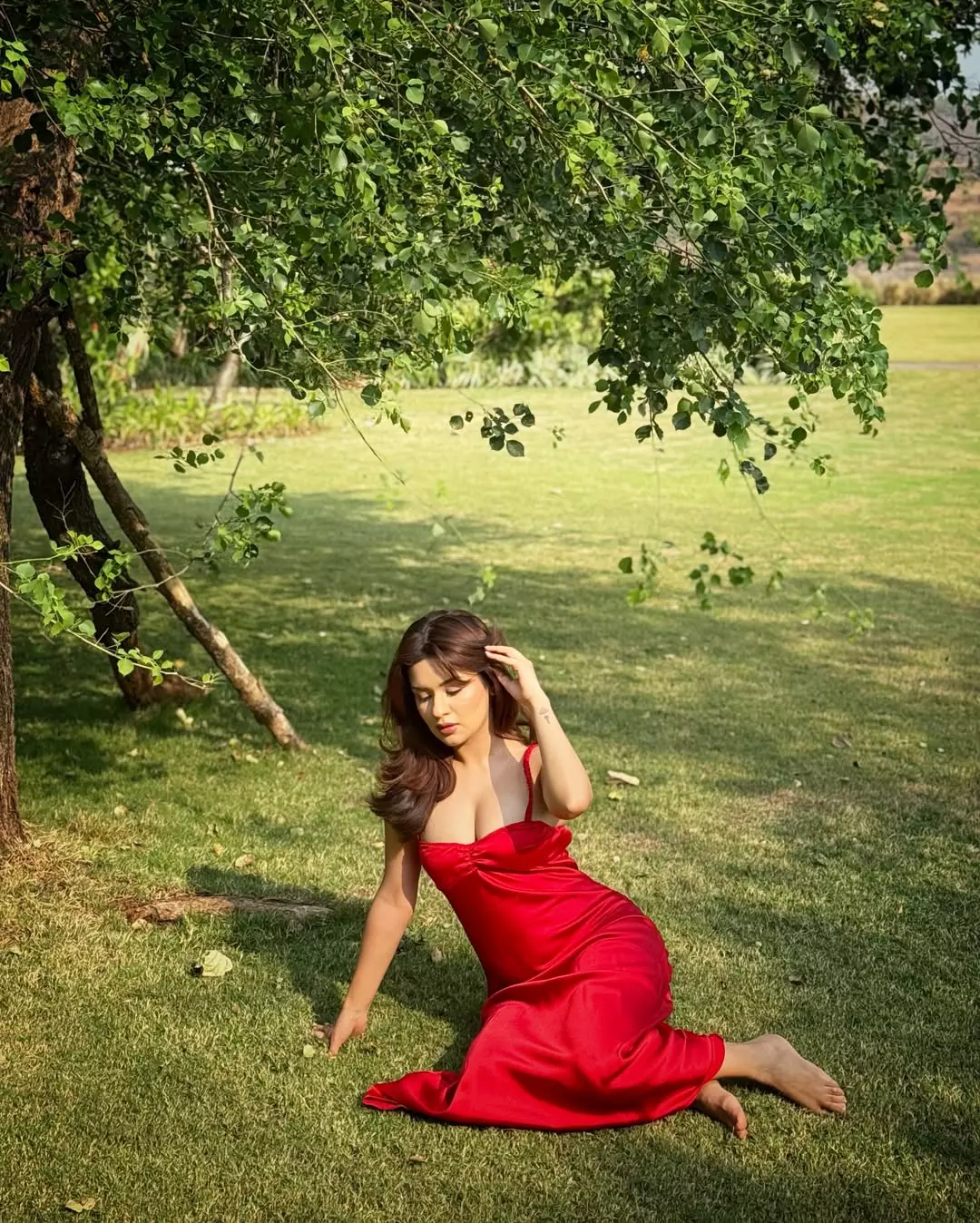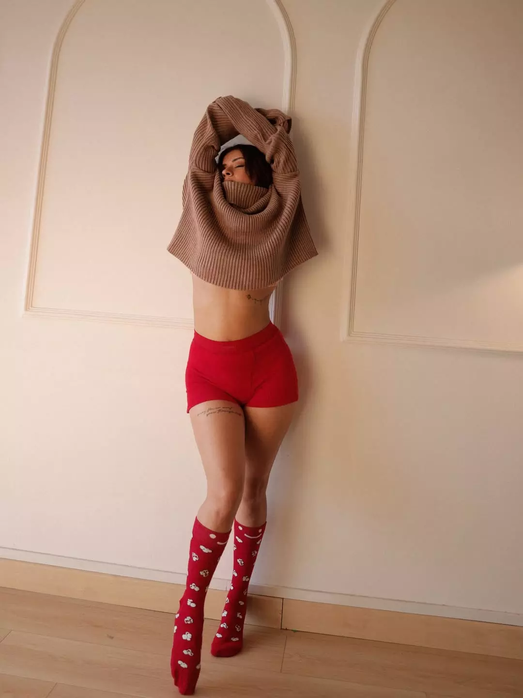 Avneet Kaur once again caught everyone’s attention with her latest Instagram post, where she shared a stylish picture that quickly went viral. In the photo, Avneet is seen standing against a simple wall, wearing a loose brown sweater, bright red shorts, and matching red socks.