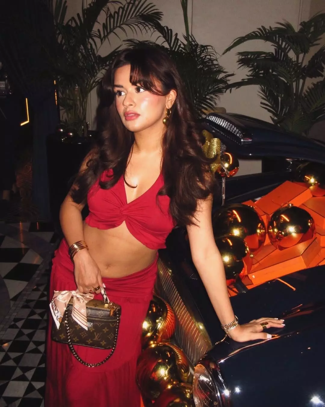 Avneet Kaur dazzled in a stunning red velvet gown from @leaclothingco, posing elegantly on a luxurious balcony with eyes closed and head tilted back in pure bliss. The caption "Only me " perfectly captured her confident, intimate vibe in this glamorous shot.