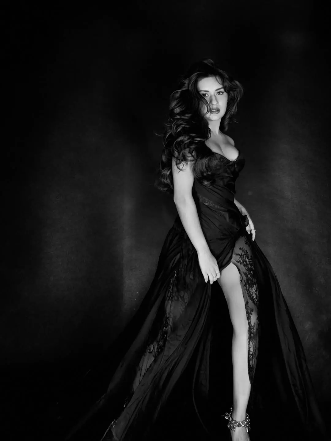 The fitted silhouette beautifully highlights her poised personality, while her relaxed pose and flowing hair add a touch of cinematic charm. The black-and-white aesthetic elevates the mood of the picture, making the moment feel artistic and dramatic. Avneet’s calm expression and confident body language capture the essence of a star who knows how to command attention without trying too hard.