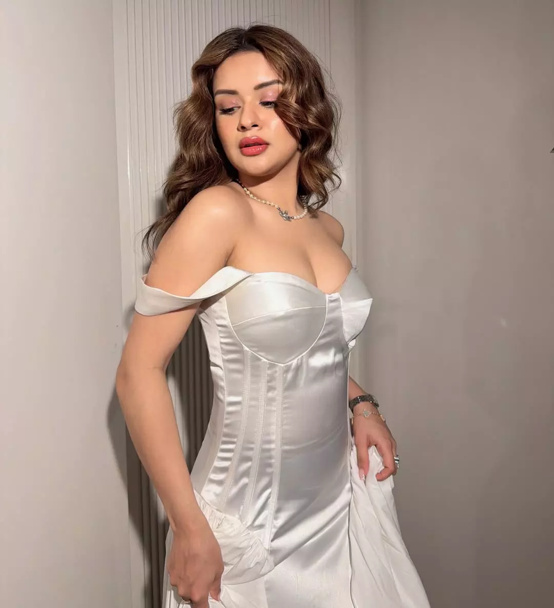 Avneet Kaur dazzles in this elegant white off-shoulder satin corset gown from @kostume_county, exuding timeless sophistication with soft waves, glowing makeup, and delicate pearl jewelry.