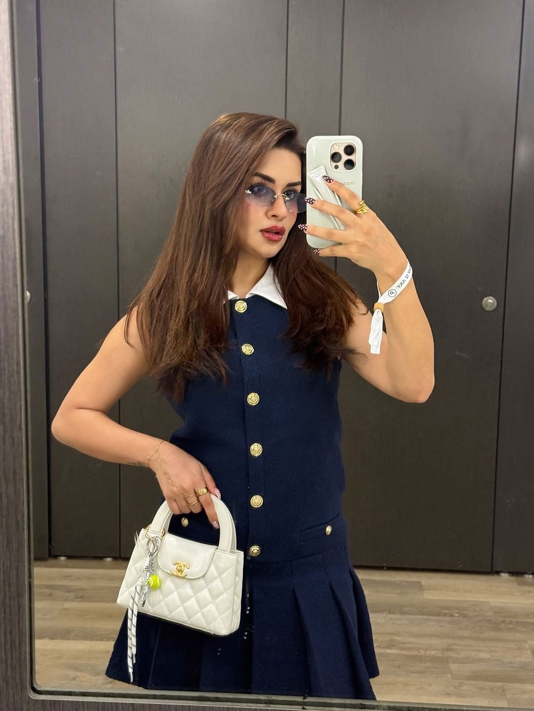 Dressed in a stylish navy dress by Maje Paris paired with a Chanel bag and Miu Miu shades