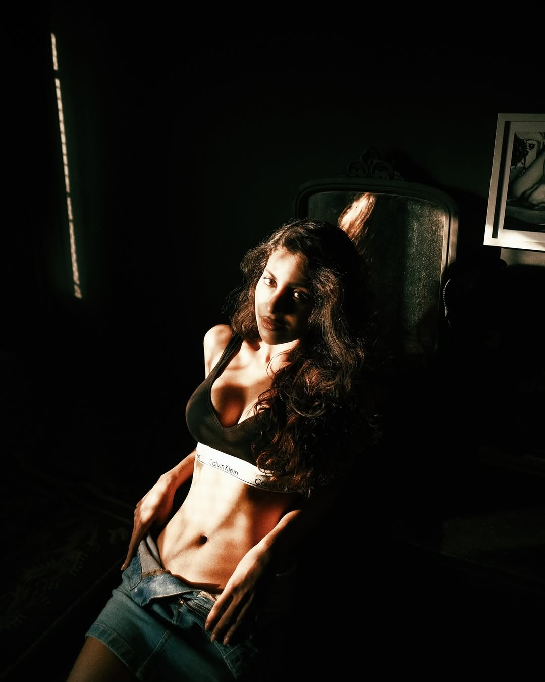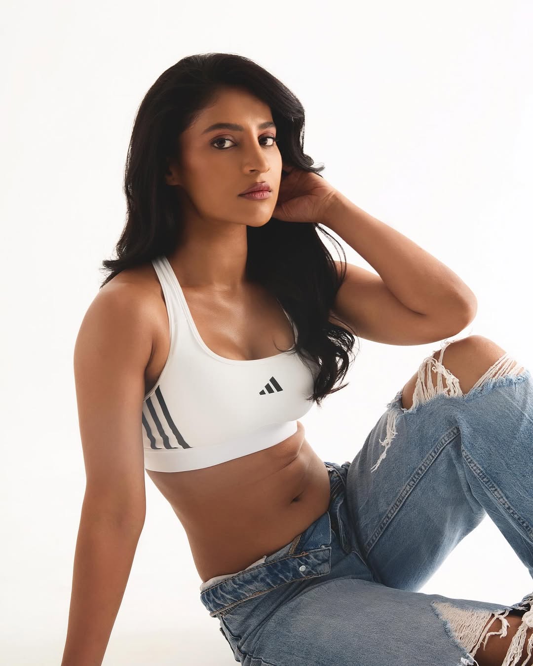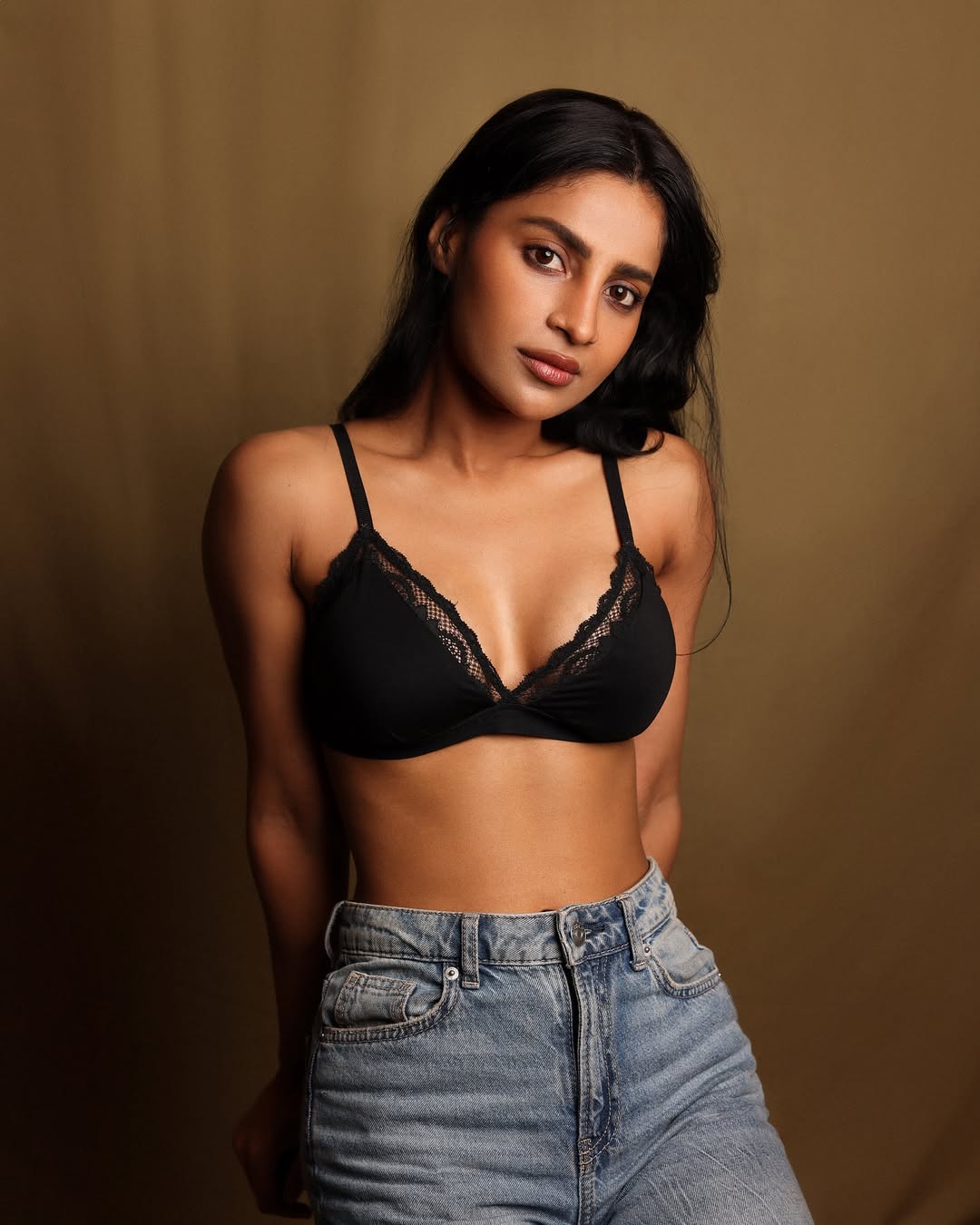 Ayra Krishna commands attention in this intense studio photoshoot, reclining gracefully on a deep maroon floor that matches her form-fitting lace dress.