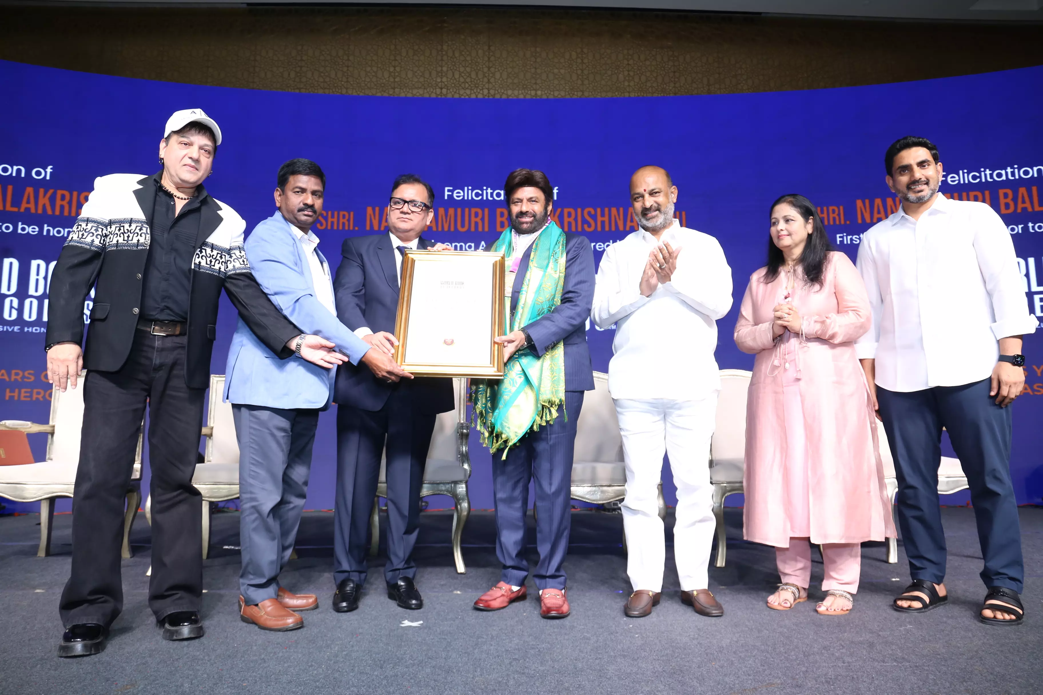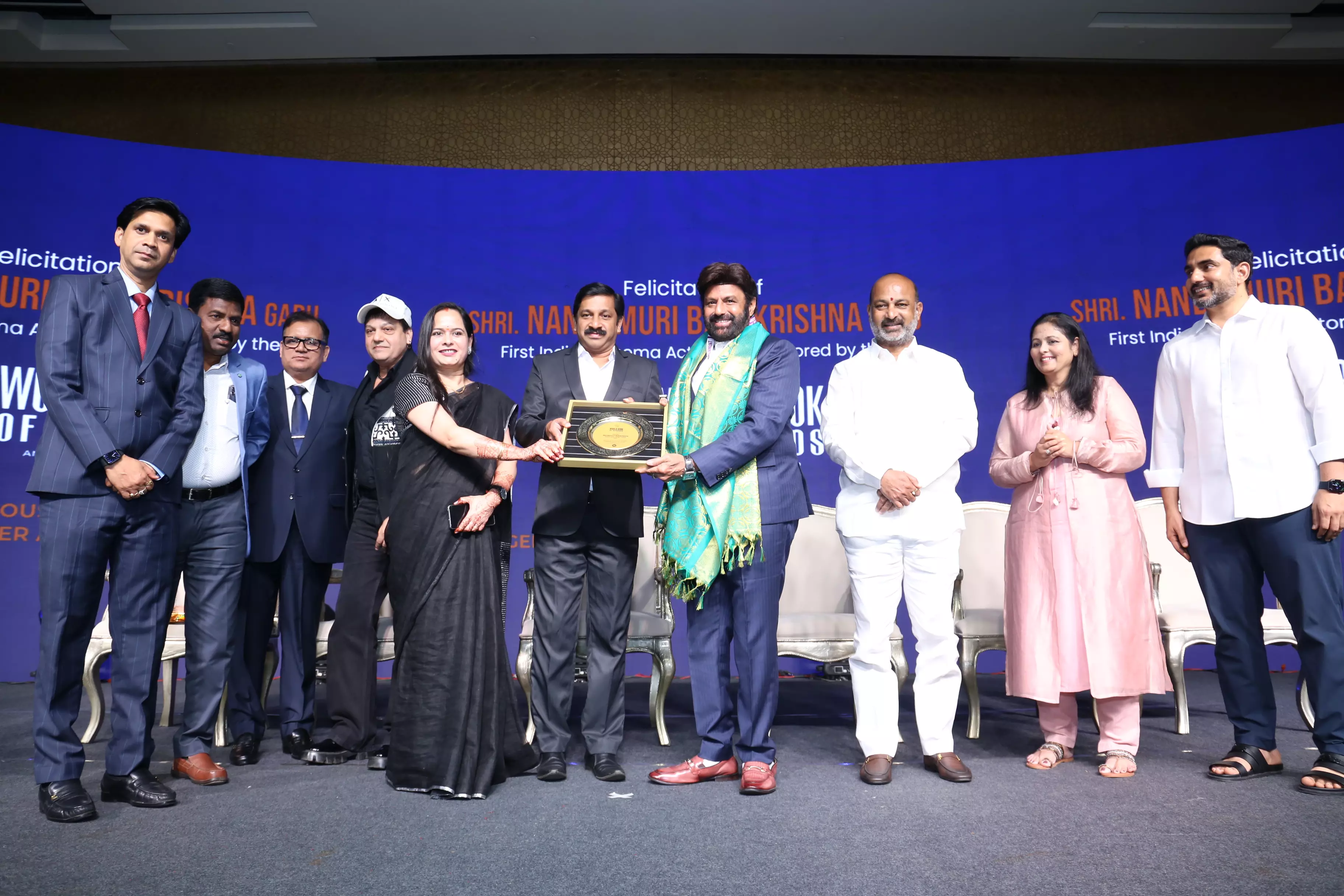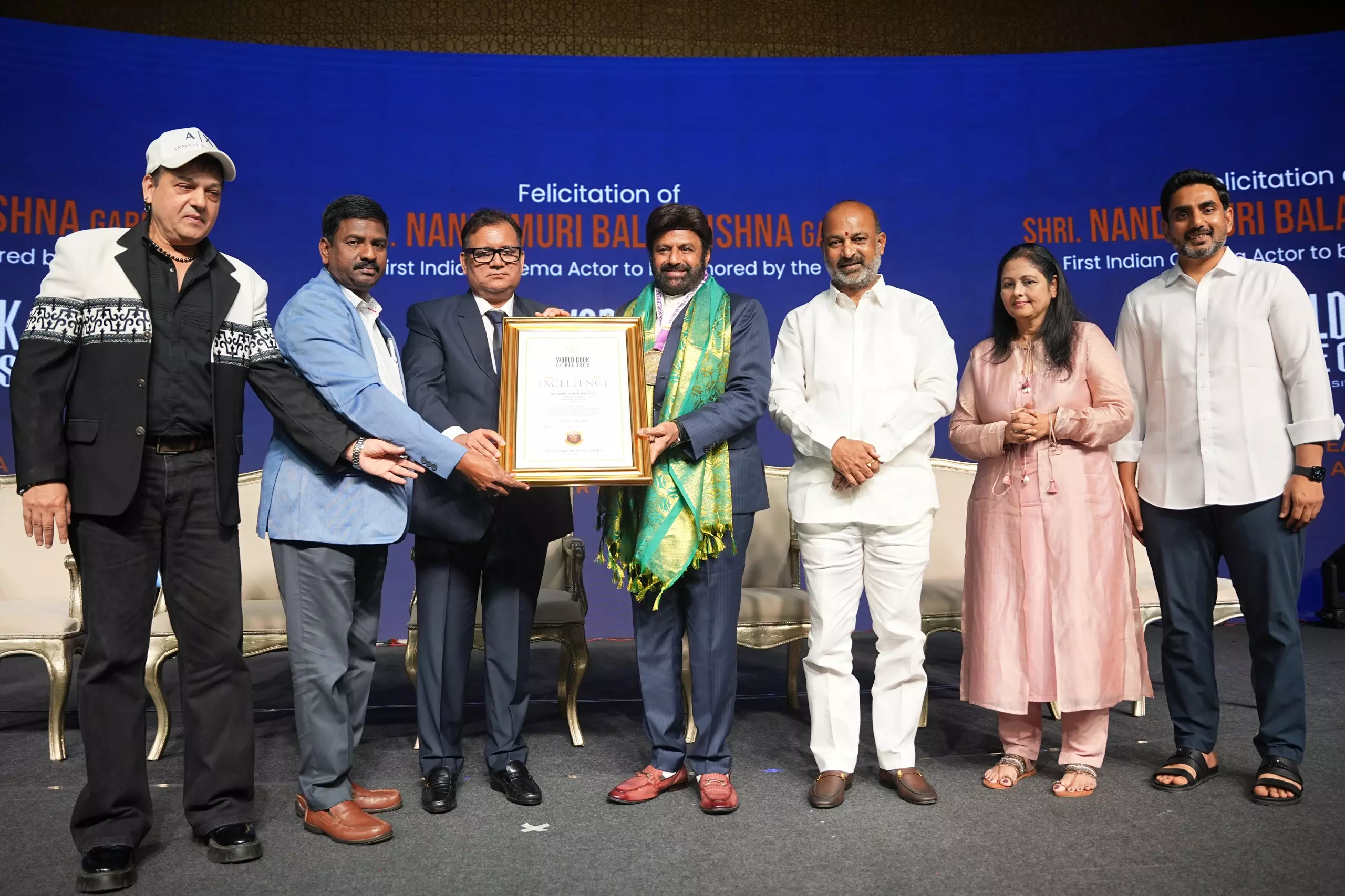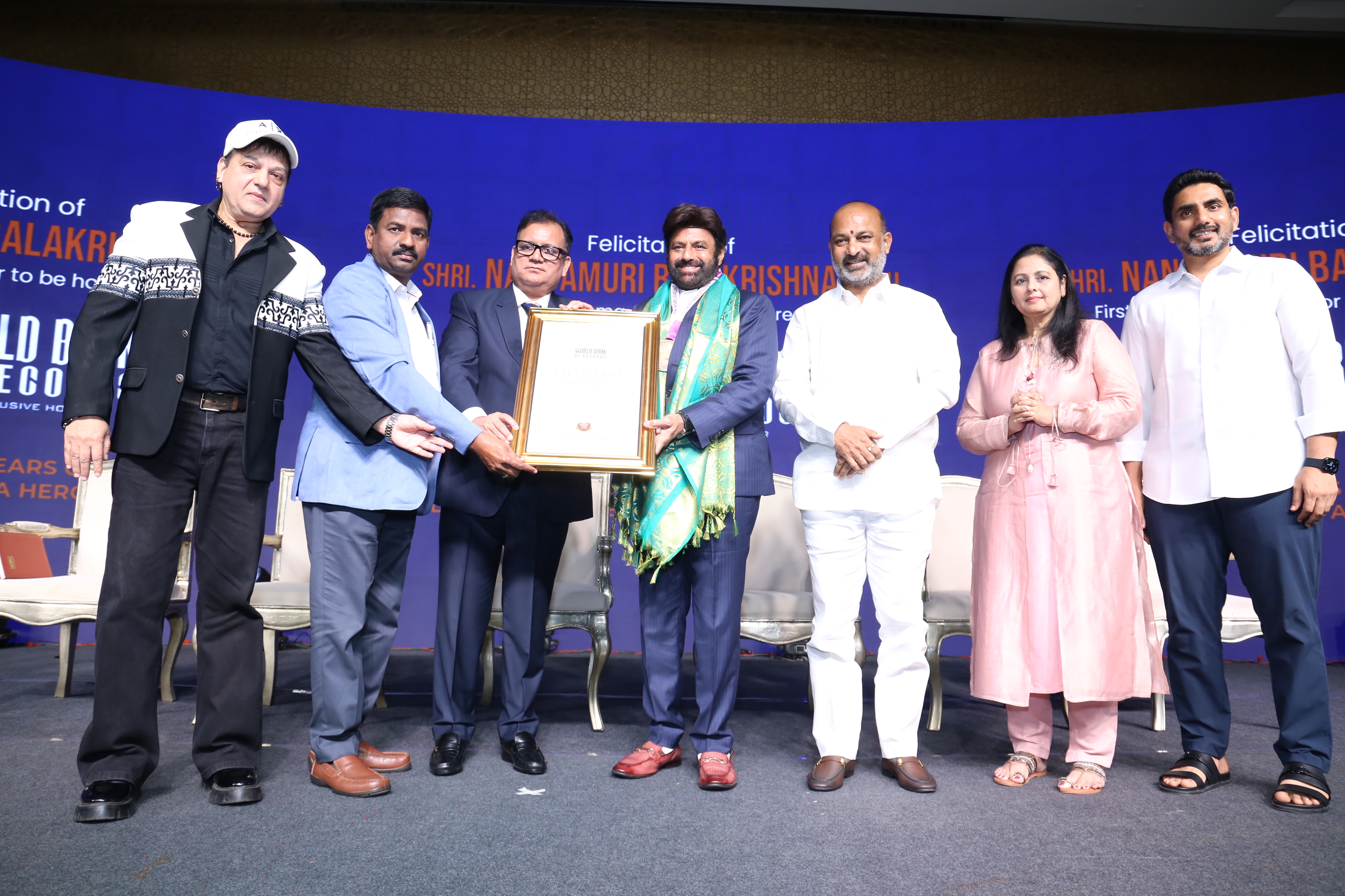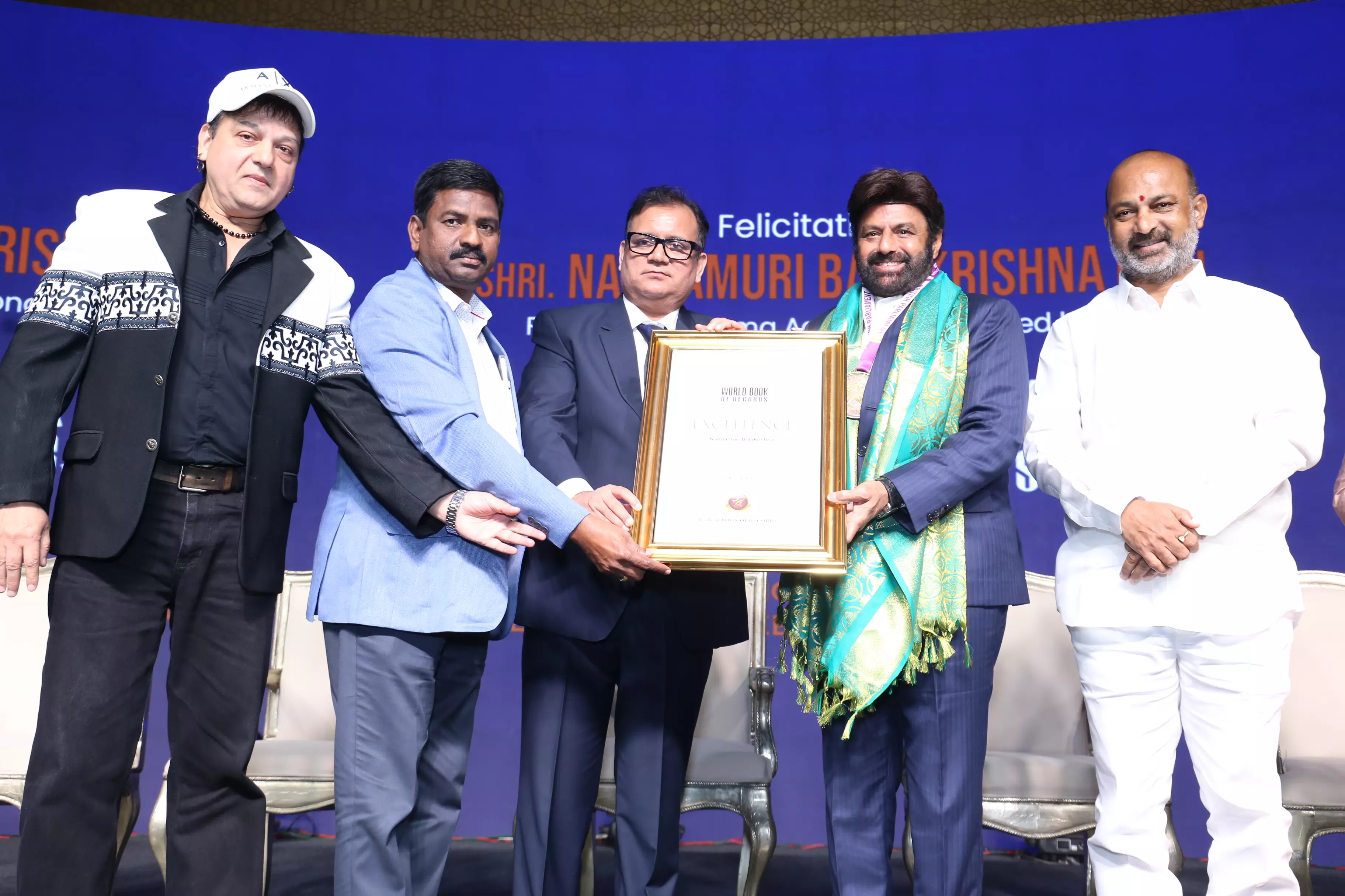 Renowned actor Balakrishna has been honored with a rare distinction by the World Book of Records (Gold Edition), making him the first actor from the Indian film industry to receive this prestigious recognition