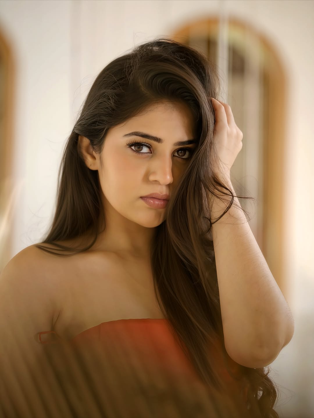 Her subtle expression and captivating gaze seem to tell a story of poise and depth—probably that’s the stare u want 🫣. The soft lighting and composition highlight her flawless features, making the portrait both intimate and visually compelling. Every element, from the styling to the backdrop, works harmoniously to bring out her refined beauty.