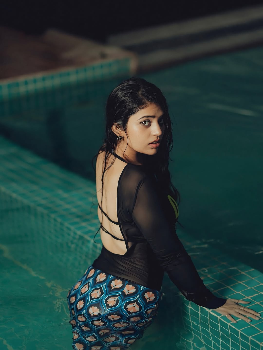 Bandhavi Sridhar shared a new post on Instagram. She was seen sitting by the poolside with water all around her. The image gave a calm and fresh vibe. Her look and mood matched the relaxed setting.